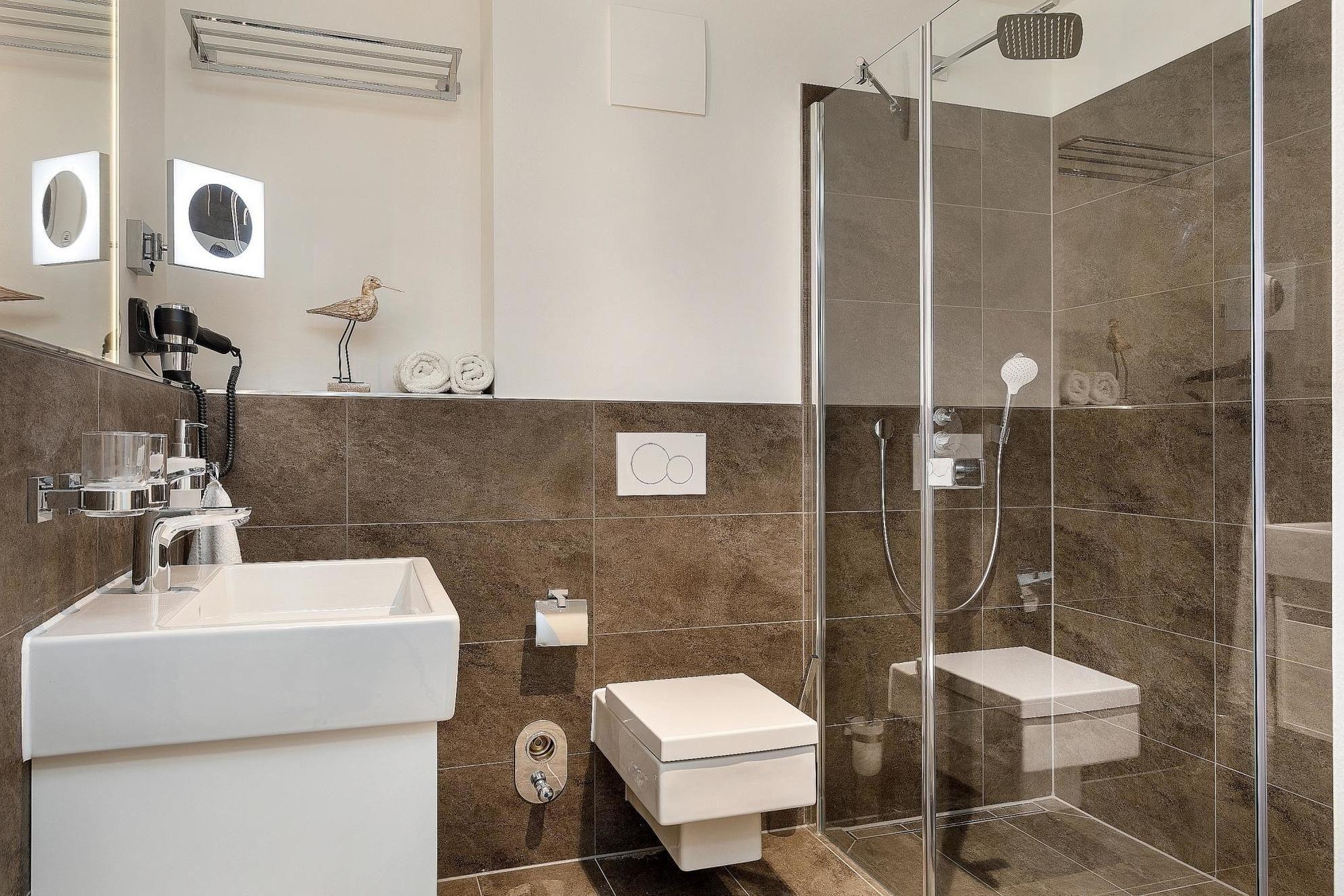 Die Ferienwohnung bietet eine moderne und komfortable Unterkunft, die auf die Bedürfnisse von Gästen aller Art zugeschnitten ist. Sie verfügt über ein gemütliches Schlafzimmer mit einem Doppelbett und einem Badezimmer mit einer bodengleichen Dusche sowie einem Haartrockner. Die offene Küche ist bestens ausgestattet und verfügt über einen Geschirrspüler, Elektro- und Gasherd, Backofen, Kühlschrank, Kaffeemaschine und Toaster, während die Essbereiche Platz für gesellige Stunden bieten.