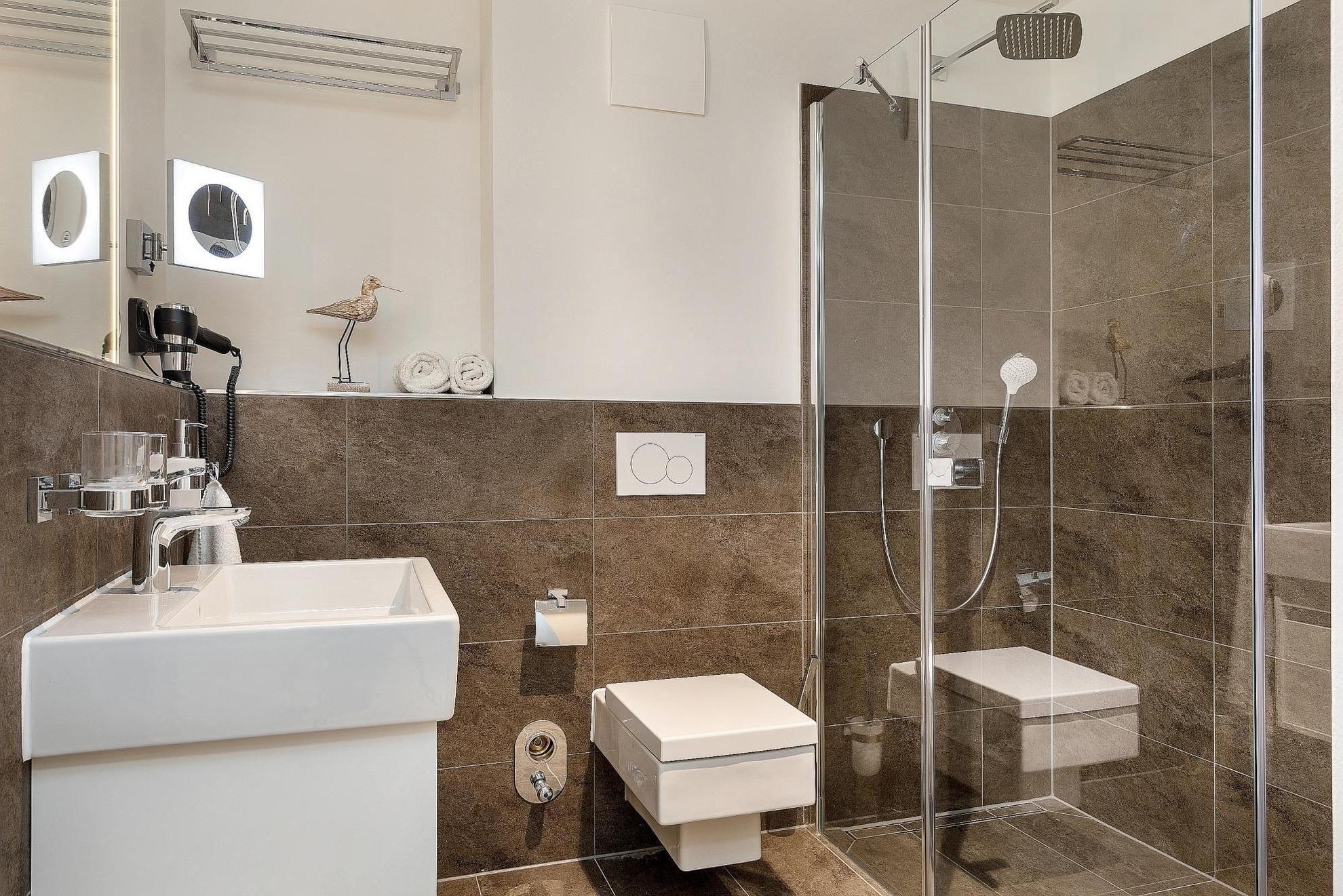Die Ferienwohnung bietet einen hohen Wohnkomfort mit zwei Schlafzimmern, in denen sich jeweils ein Doppelbett befindet. Der offene Wohnbereich ist mit einem gemütlichen Sofa und Sessel ausgestattet und lädt zum Entspannen ein. Eine moderne offene Küche erwartet die Gäste mit hochwertigen Geräten wie Geschirrspüler, Elektro-/Gasherd, Backofen, Mikrowelle und Kühlschrank. Die bodengleiche Dusche im Badezimmer ist barrierefrei und sorgt für zusätzlichen Komfort.