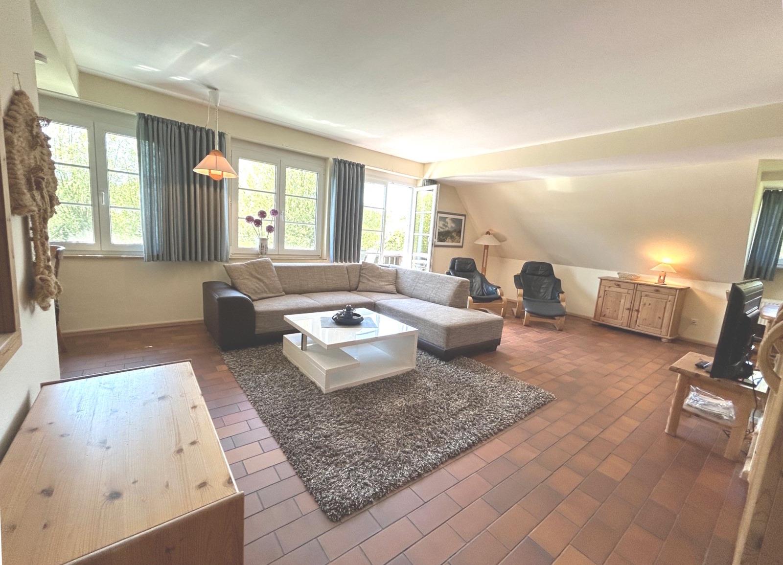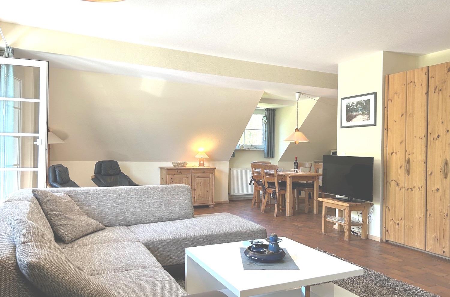 3 Zimmer-Maisonette ca. 75 qm für 2-6 Personen, Haus C in der Residenz Kormoran, Grüne Straße 45A-R, Ostseebad Prerow. 1.OG: Wohnzimmer mit Schlafcouch, Sitzgarnitur, Kleiderschrank, SAT-TV/Radio, WLAN, Duschbad/WC, Balkon, Essecke mit Küchenzeile (Spülmaschine). 2.OG: 2 Schlafzimmer, 1x Doppelbett, 1x 2 Einzelbetten, Dusche/WC