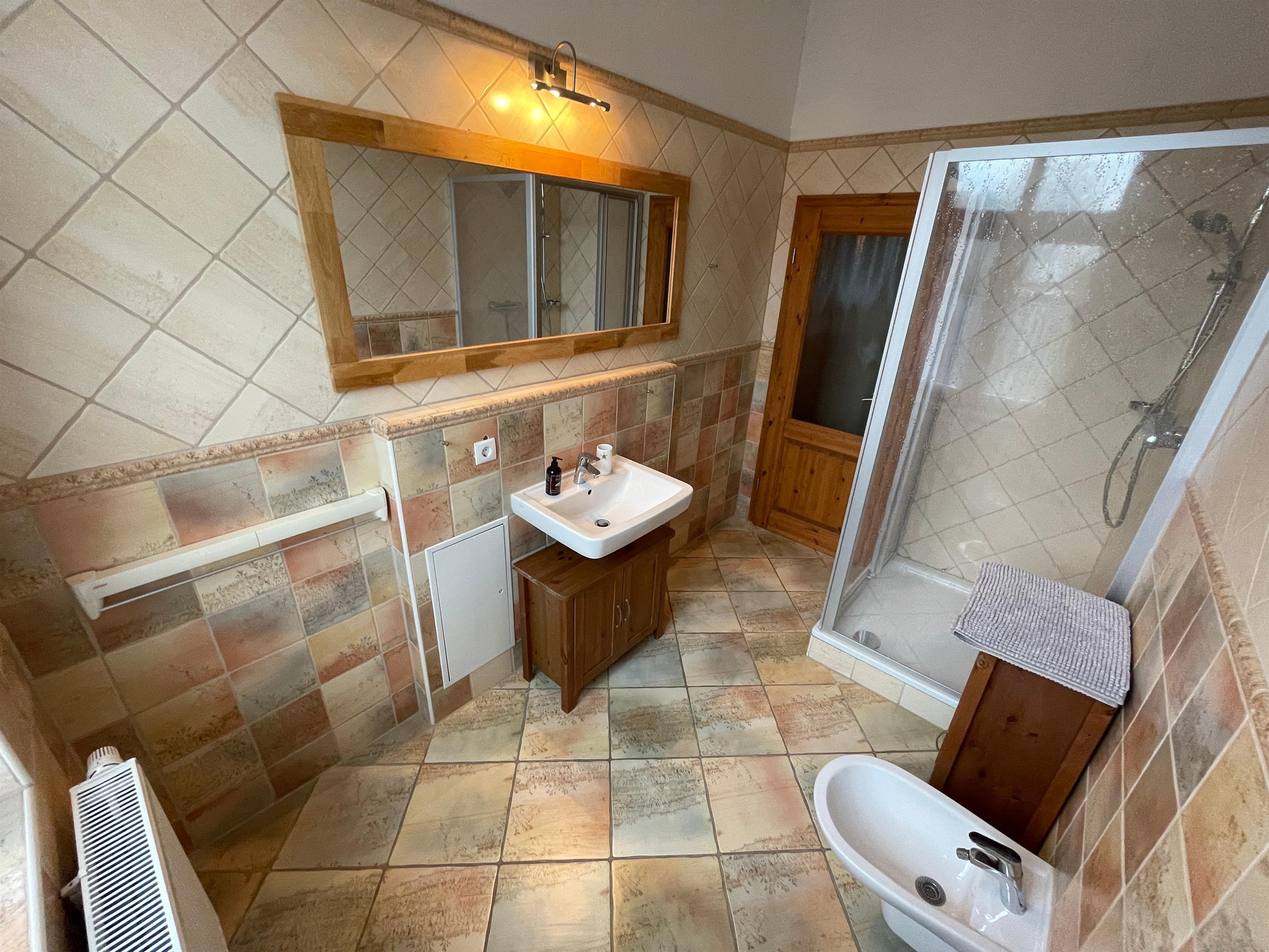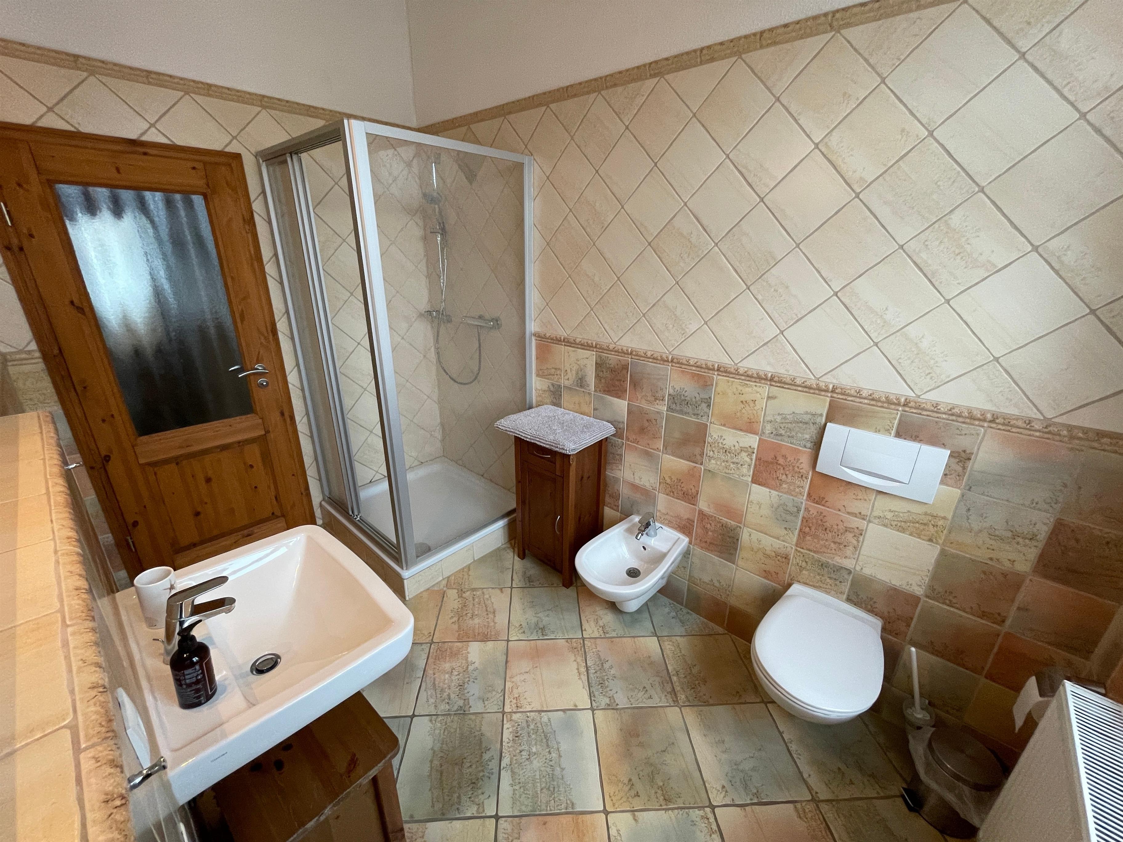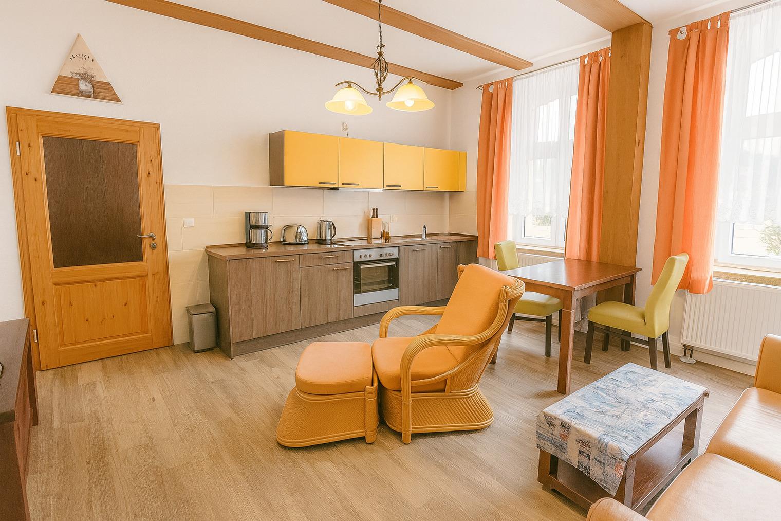 Unsere Ferienwohnung verfügt über zwei komfortable Schlafzimmer, jeweils mit einem gemütlichen Doppelbett. Das geräumige Wohnzimmer lädt zum Verweilen ein und bietet eine behagliche Atmosphäre zum Entspannen. Die hochwertige Küche ist voll ausgestattet und bietet alles, was Sie zum Kochen und Genießen benötigen. Ein Kinderhochstuhl und ein Babybett stehen für unsere kleinen Gäste zur Verfügung. Das moderne Badezimmer mit Dusche und Bidet sorgt für zusätzlichen Komfort während Ihres Aufenthalts.