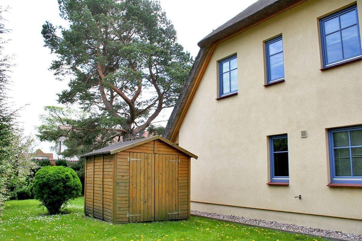 Ein Parkplatz, sowie ein Geräteschuppen zum Unterstellen von Fahrrädern sind auf dem Grundstück vorhanden.