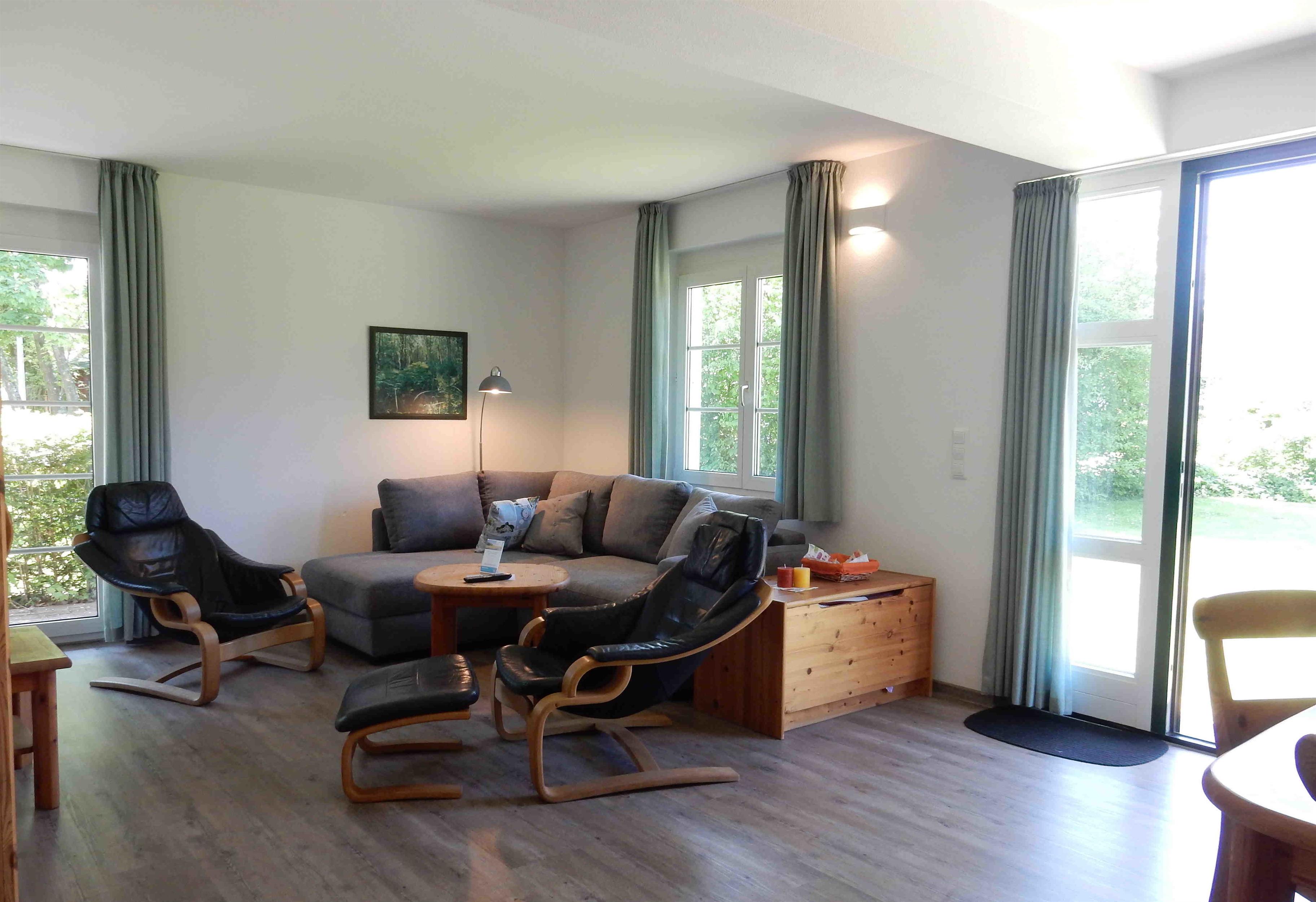 2 Zimmer ca. 54 qm, EG im Haus A, Residenz Kormoran, Grüne Straße 45A-R, Ostseebad Prerow, für 1-4 Personen. Wohnzimmer mit Schlafcouch, WLAN, Sitzgarnitur, SAT-TV/Radio, Esstisch, Küchenzeile, Schlafzimmer, Dusche/WC, extra WC, Terrasse
