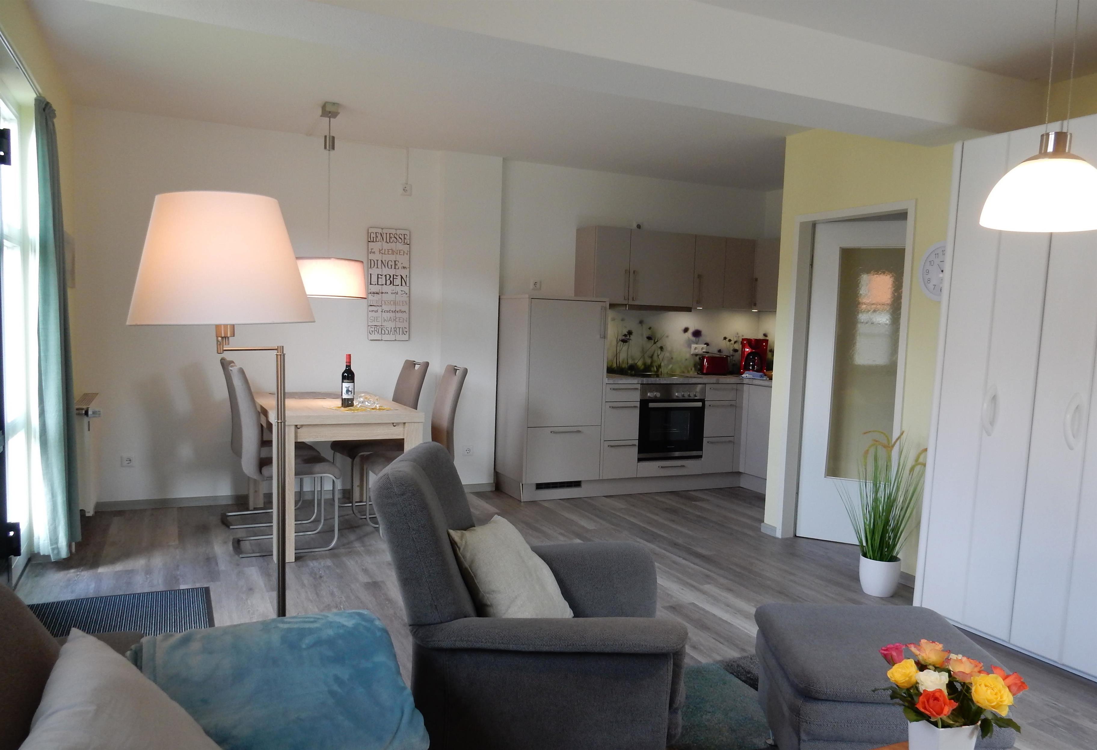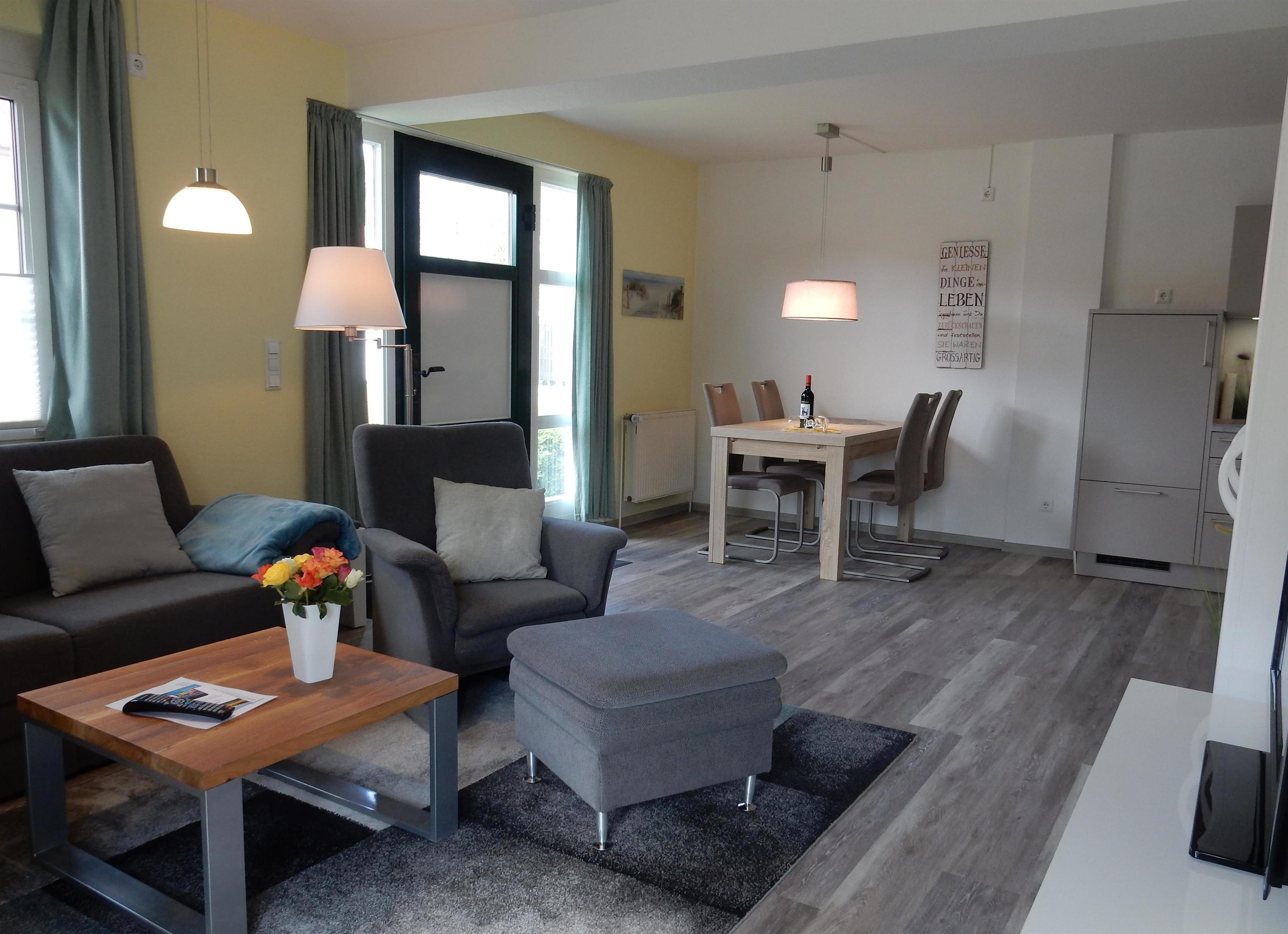 2 Zimmer ca. 54 qm, EG im Haus A, Residenz Kormoran, Grüne Straße 45A-R, Ostseebad Prerow, für 1-4 Personen. Wohnzimmer mit Schlafcouch, WLAN, Sitzgarnitur, SAT-TV/Radio, Esstisch, Küchenzeile, Schlafzimmer, Dusche/WC, extra WC, Terrasse