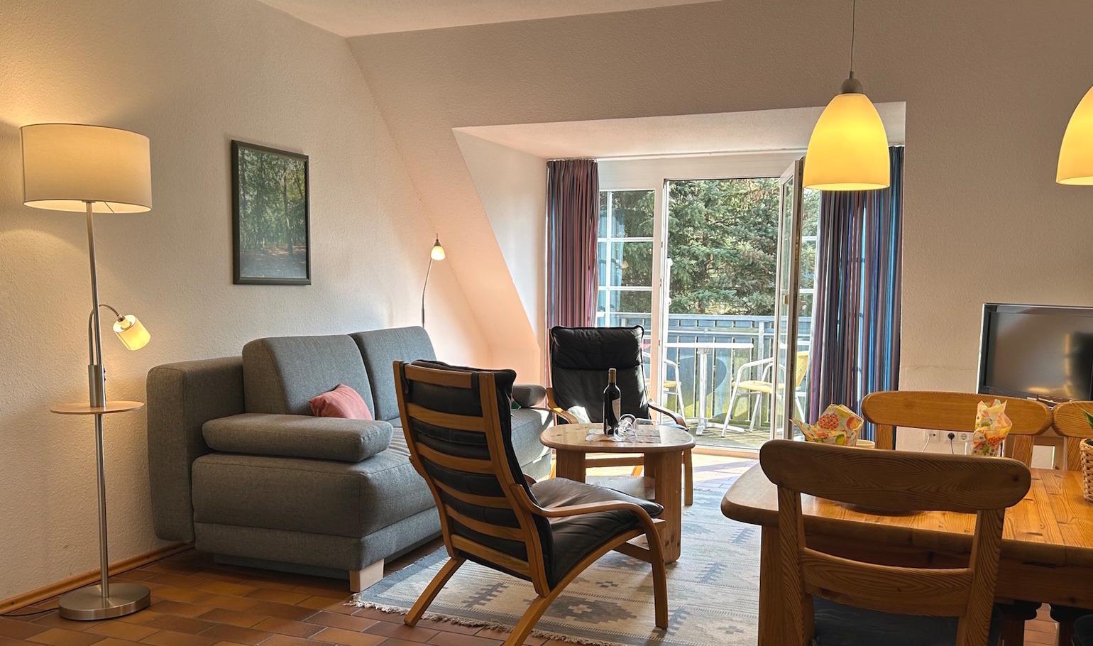 2 Zimmer ca. 50 qm für1-4 Personen, 1. OG im Gästehaus Kormoran, Waldstraße 64 b, Ostseebad Prerow. Wohnzimmer mit Schafcouch, Sitzgarnitur, SAT-TV/Radio, WLAN, Esstisch, moderne Küchenzeile mit Backofen, Geschirrspülmaschine, Ceranfeld, Mikrowelle, Schlafzimmer mit Doppelbett, Dusche/WC, Gäste-WC, Süd-West-Balkon.