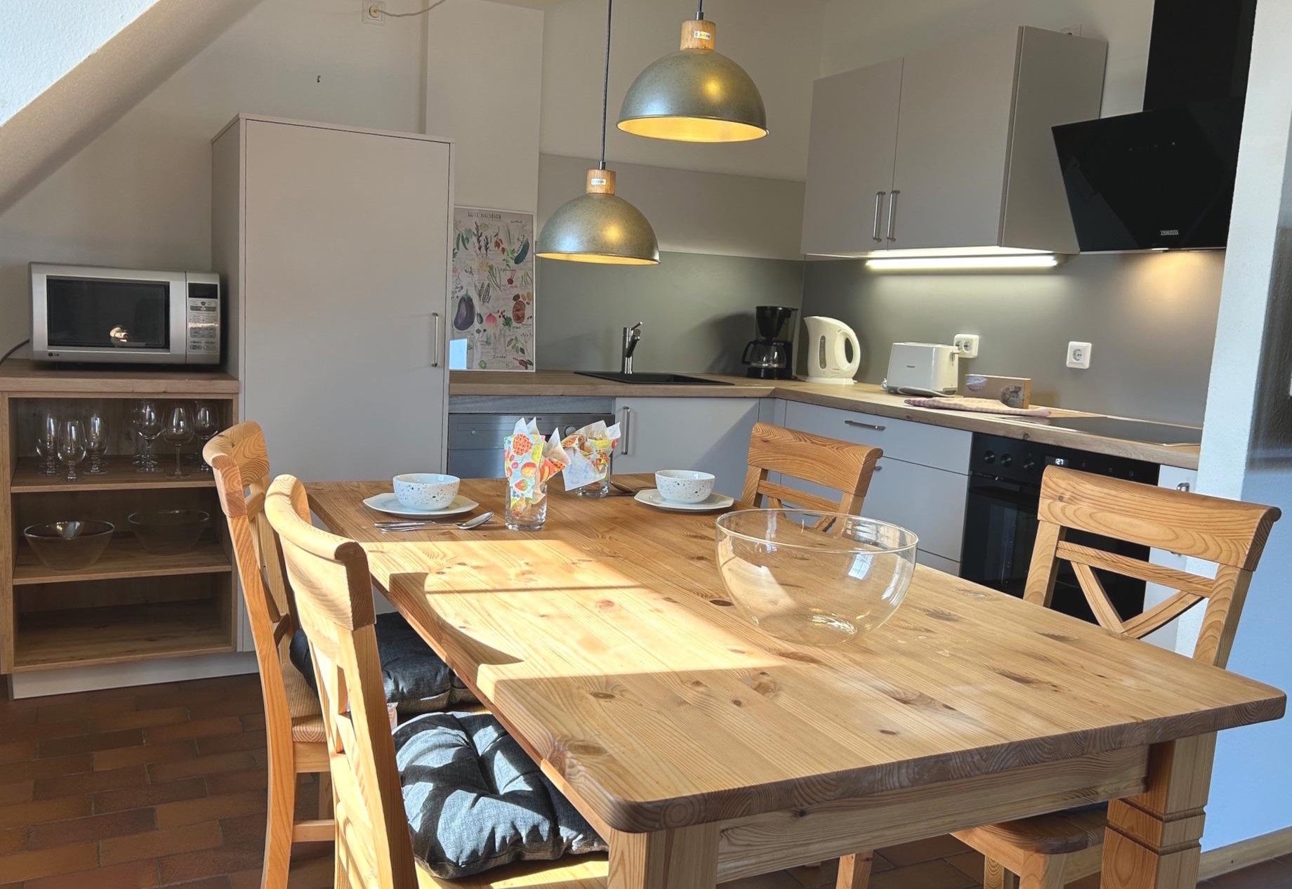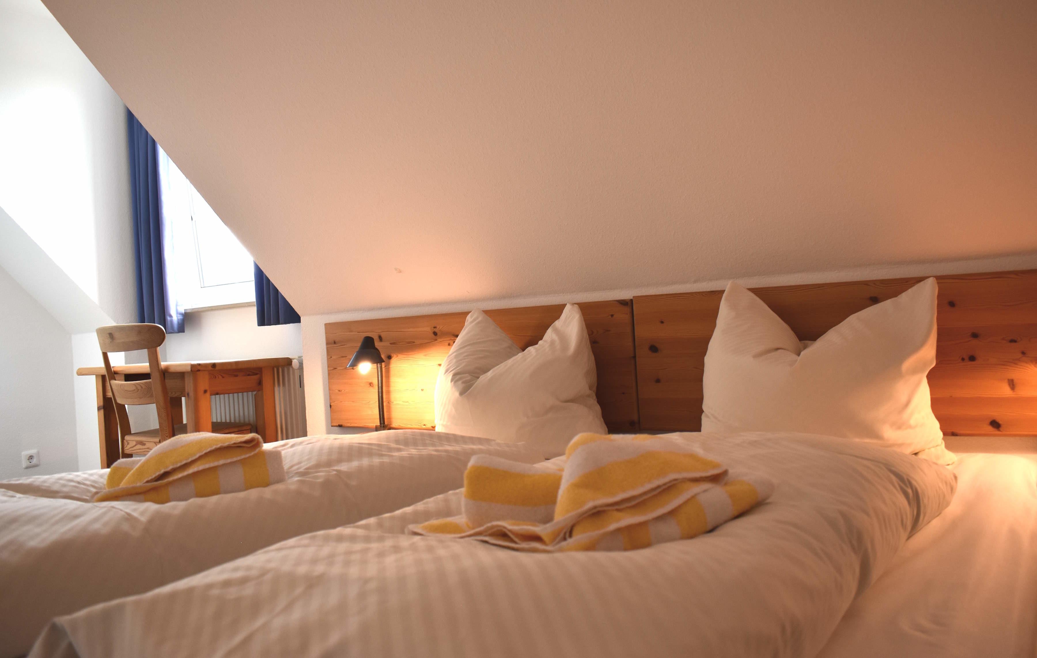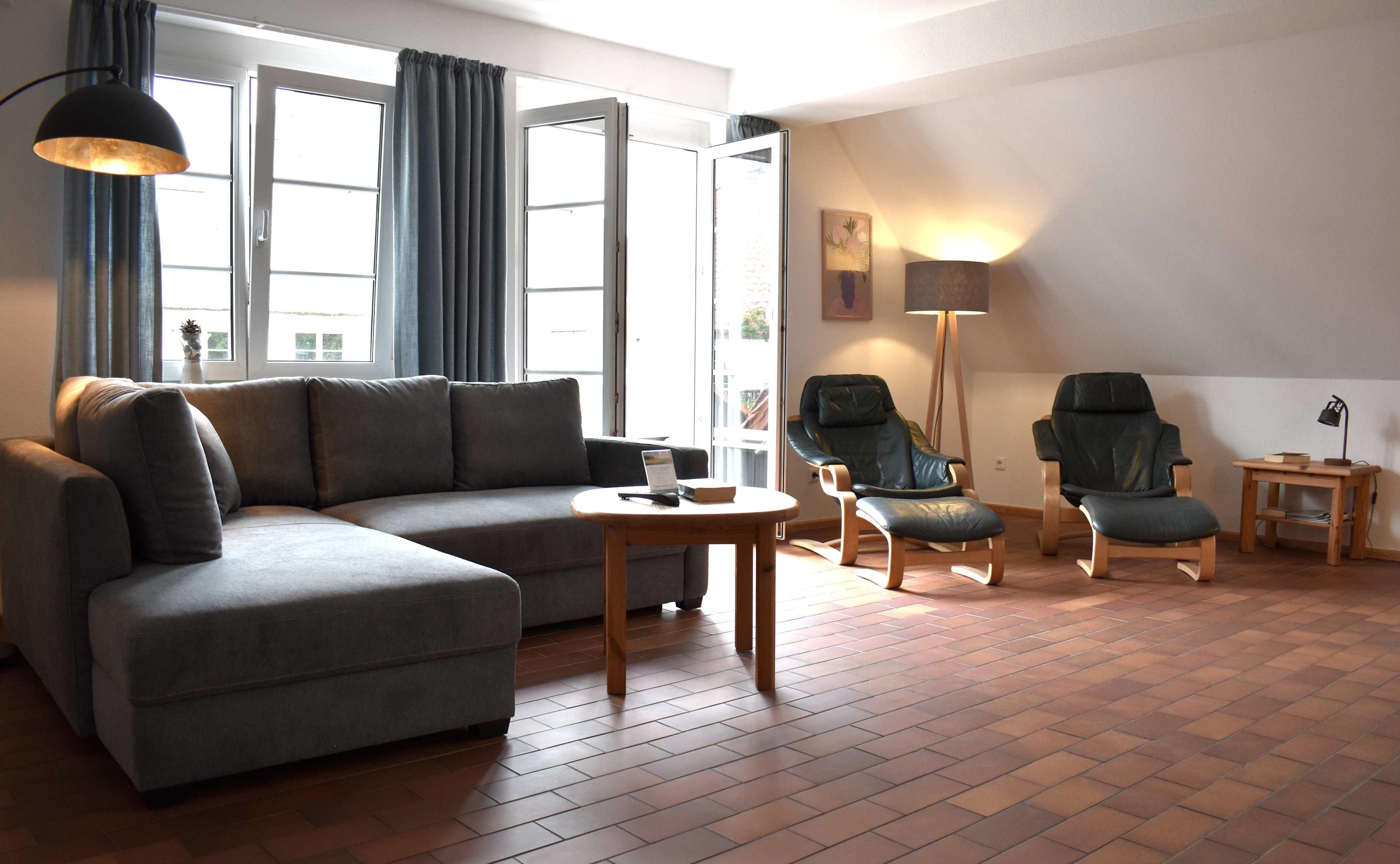 3 room maisonette about 75 sqm for 2-4 persons. 1st floor: living room with a large couch, kitchen and dining table, SAT-TV/radio, WLAN, bathroom/WC, balcony, 2nd floor: bedroom with double bed, satellite TV, bedroom with 2 single beds, shower/WC