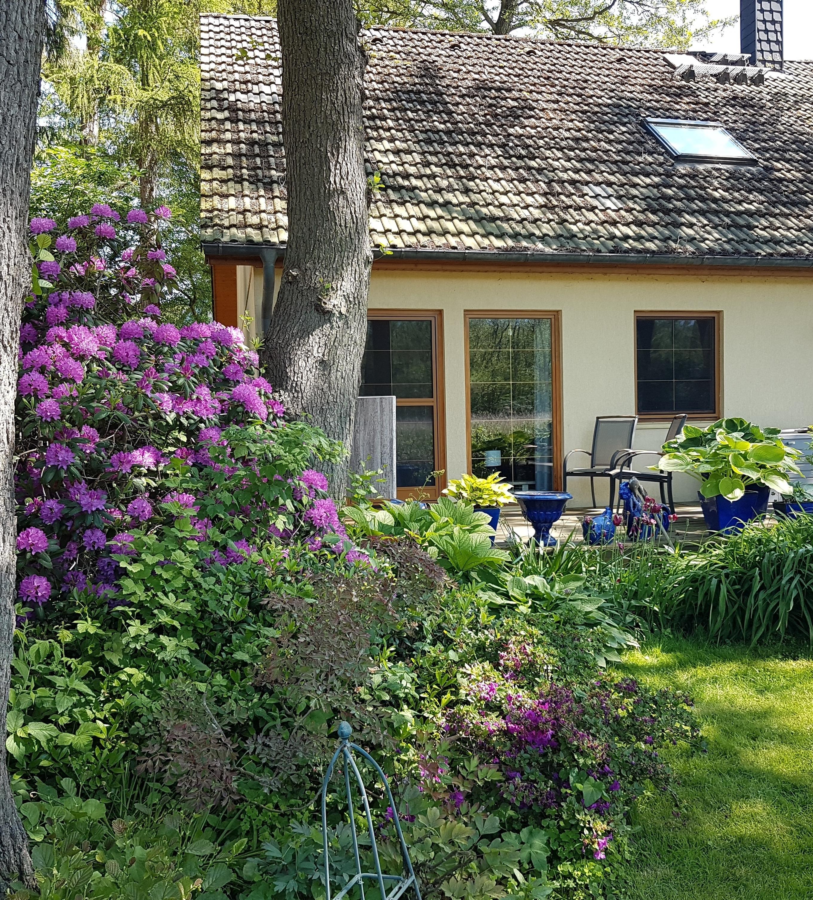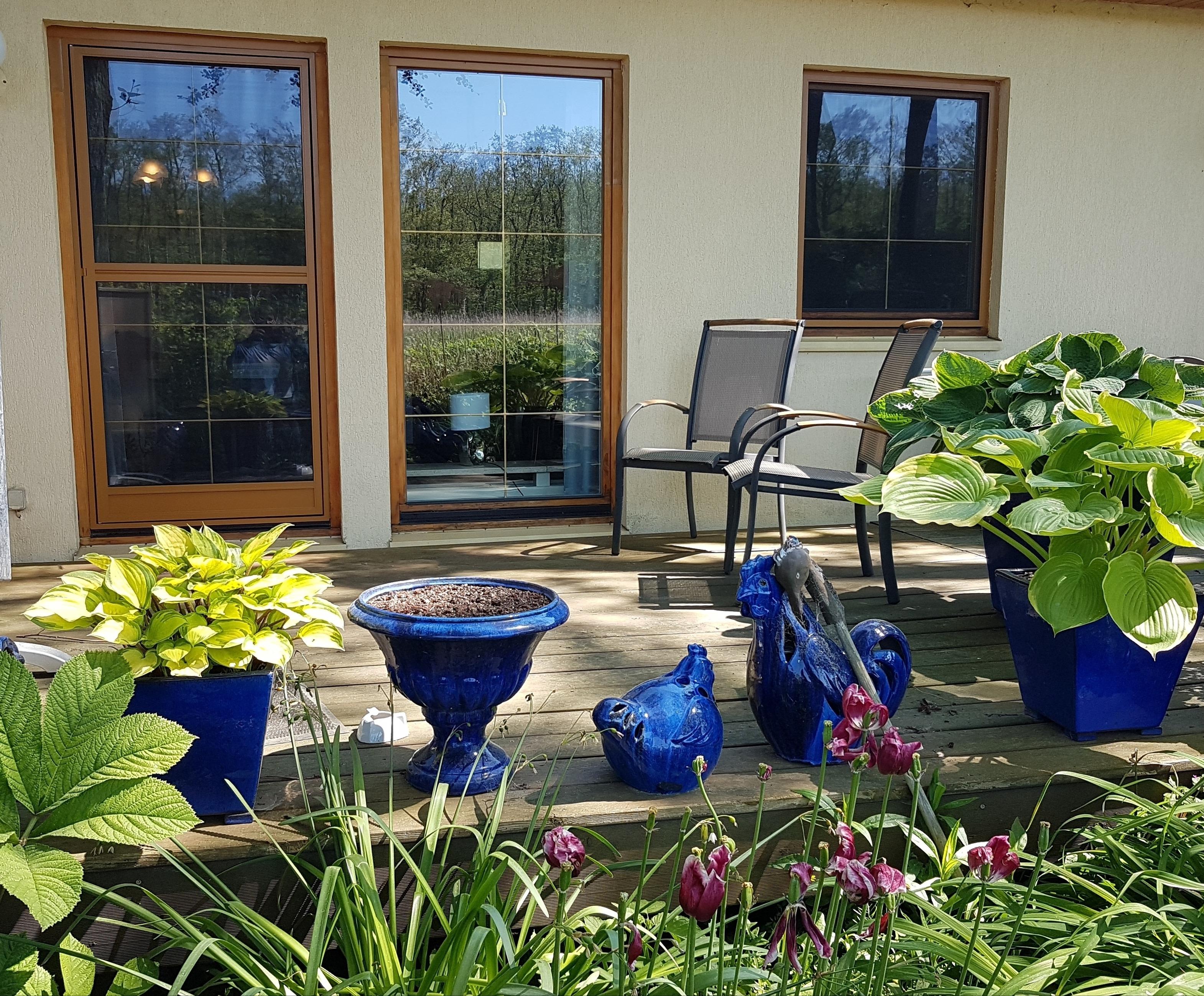 Die alten Bauernhausmöbel von anno 1848 verbreiten ihren besonderen Charme im frisch renovierten Wohn- Esszimmer in Verbindung modernem Sat-TV und Stereo-Anlage. Von hier gelangen Sie auf die Terrasse in Süd-West-Lage mit dem herrlichen Blick auf den alten Prerow Strom und den Dünenwald. Das Grundstück ist insgesamt ca. 700 m² groß und sehr gepflegt mit Terrasse, Rasenplatz und Staudenbeet.