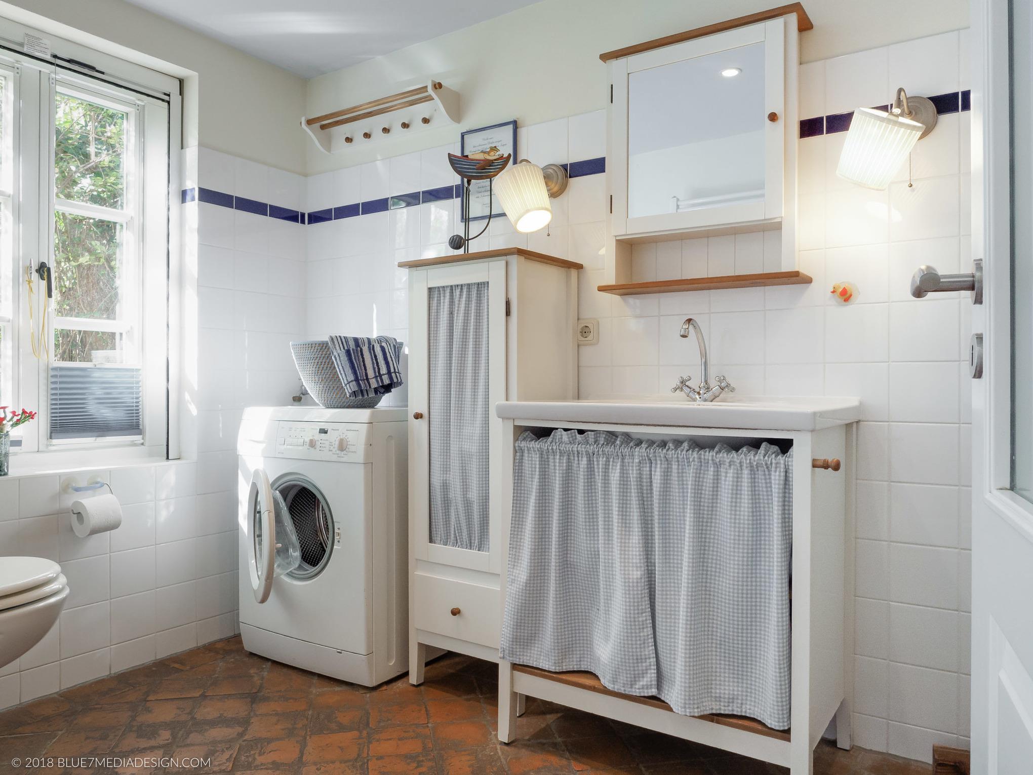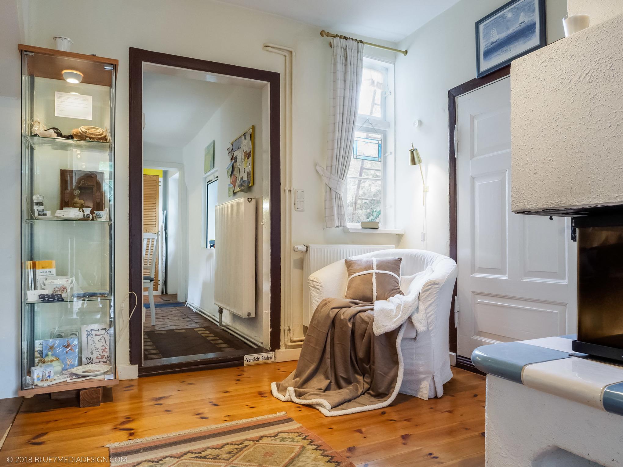 Kamin, gemütliche, z.T. antike Möbel, zahlreiche Bücher mit Bezug zur See, zu Natur und Kultur der Region (aber auch spannende Romane), Jugenstilveranda, draußen ein hübscher Bauerngarten vorm Haus, Liegewiese und Terrasse - alles sichtgeschützt umgeben von dichten, blühenden Hecken, Sträuchern und Bäumen-und auf der Ostseite ein wohnlicher, teilüberdachter Innenhof: all`dies macht die besondere Atmosphäre des kleinen Anwesens aus. Die technische Ausstattung von Küche und Sanitärbereich (mit Fußbodenheizung) ist auf moderstem Stand und vermittelt dennoch ein Gefühl von Behaglichkeit.