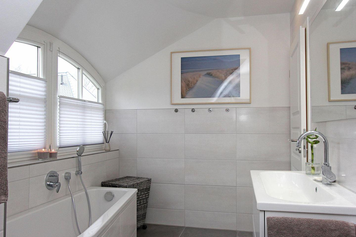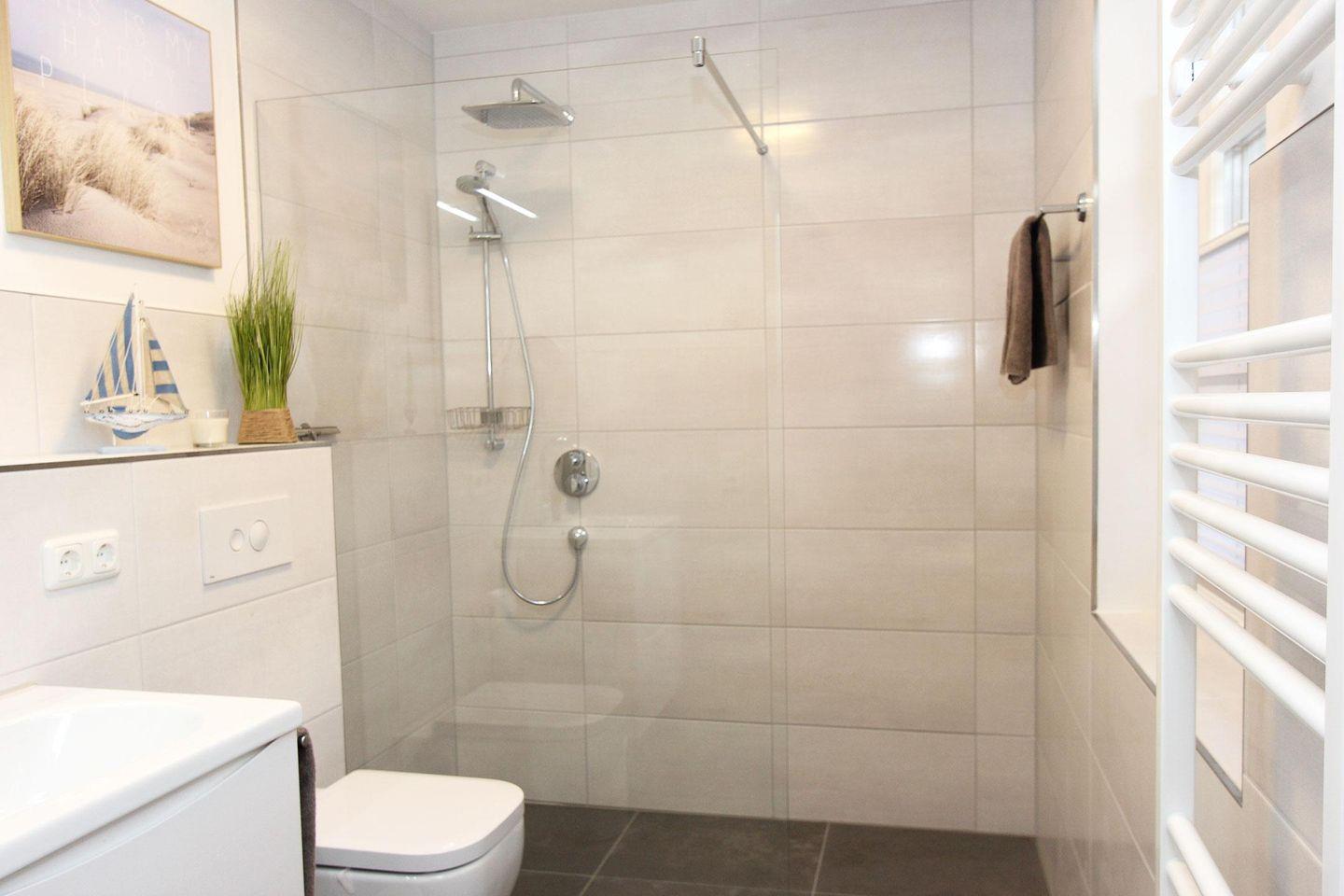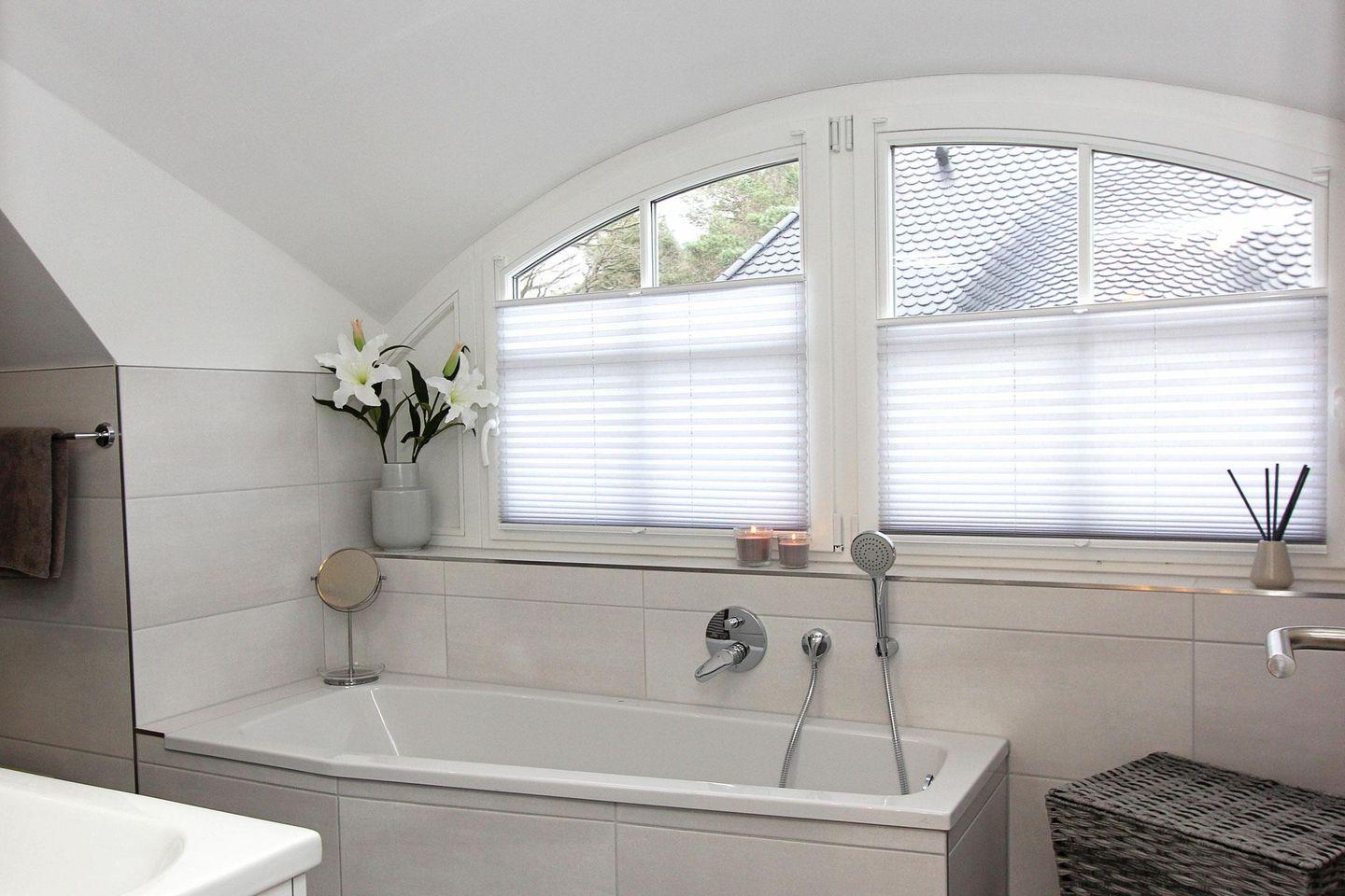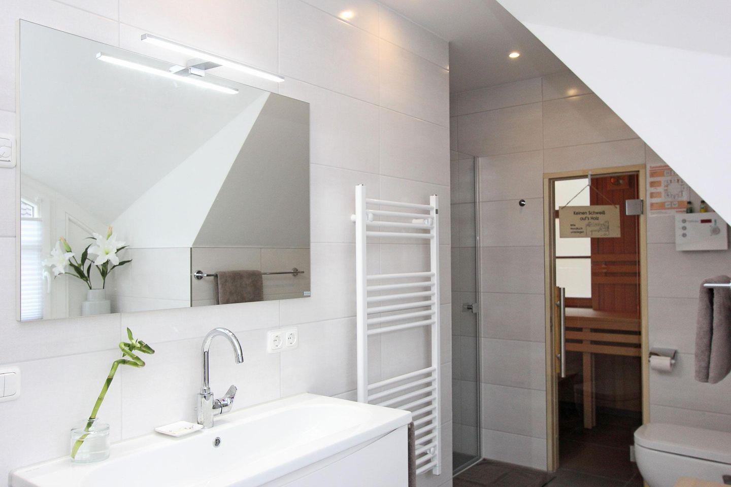 Die hochwertig ausgestattete und zum Wohnzimmer hin offene Küche lässt keine Wünsche offen. Ein großer Esstisch und eine gemütliche Couch komplettieren den Wohnkomfort. Das Haus verfügt im Erd- und Obergeschoss über ein Badezimmer. Eines mit einer geräumigen Dusche und das andere mit Dusche, Badewanne und angrenzender Sauna.