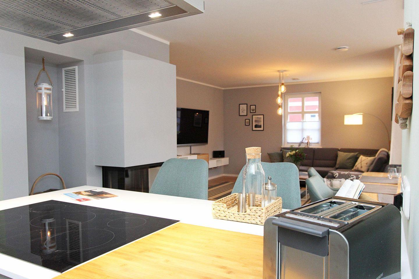 Der Lebensmittelpunkt des Hauses ist der großzügige Wohn -und Essbereich mit Kamin.