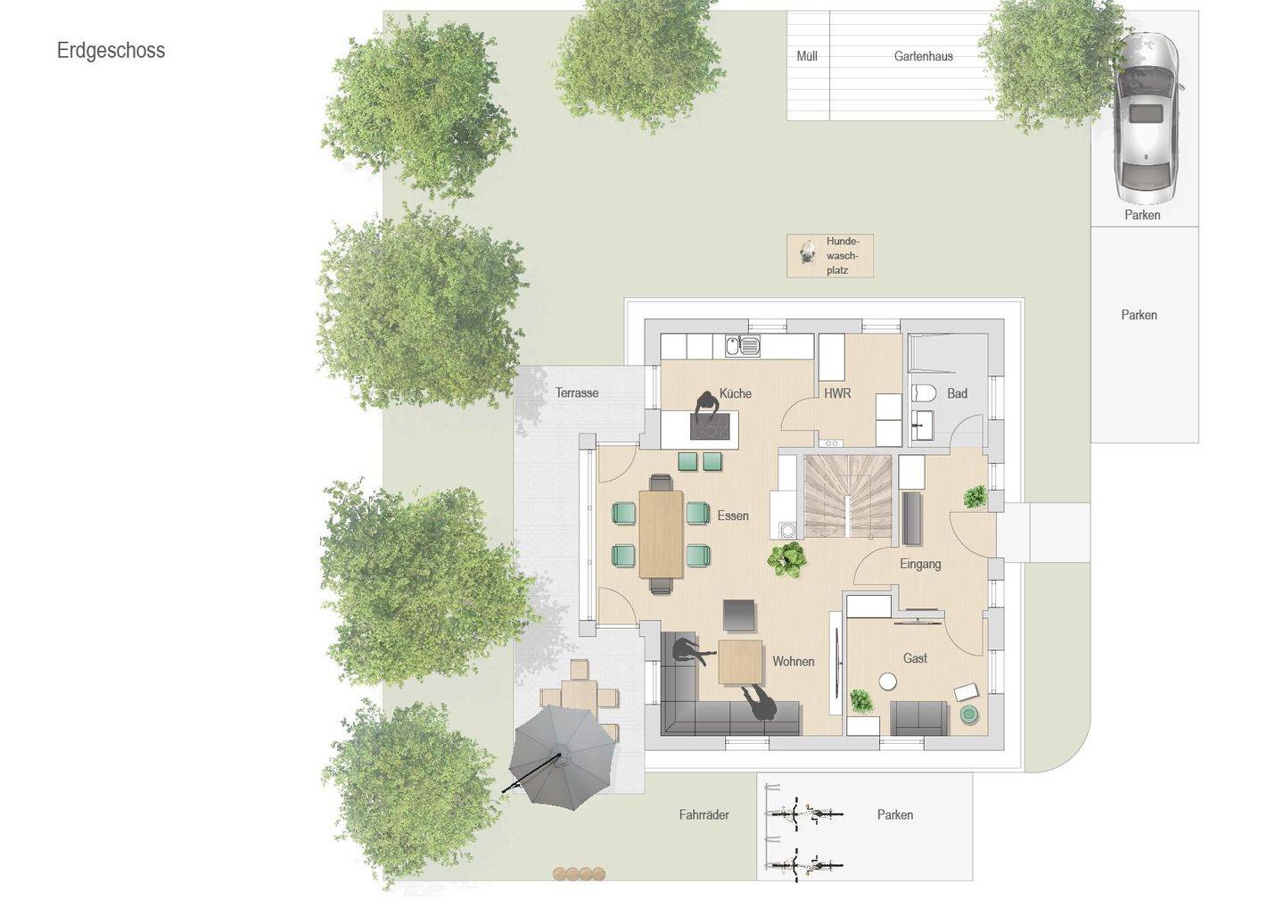 Im Außenbereich stehen Ihnen ein kleiner schön angelegter Garten, eine große Sonnenterrasse und 2 PKW-Stellplätze zur Verfügung.