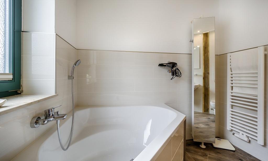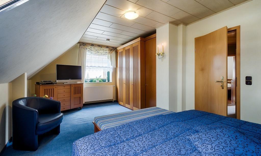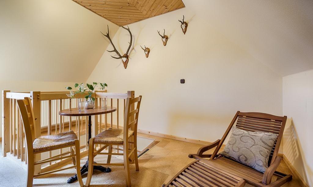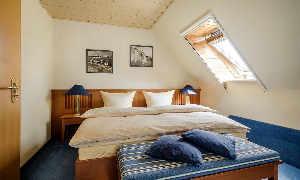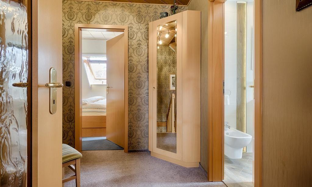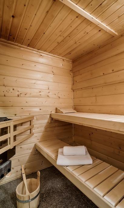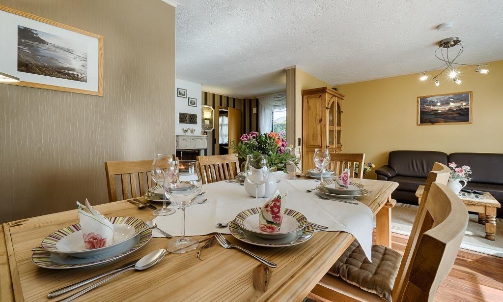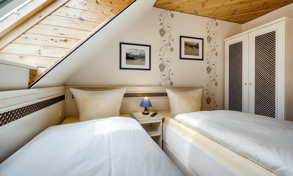 Im Erdgeschoss des Hauses erwartet dich der offene Wohnbereich mit gemütlicher Sitzecke und großem TV. Für geselliges Beisammensein - ob zum Essen oder Klönen - sorgt der großzügige Esstisch. Ein zusätzlicher Sitzplatz am Kamin rundet den Wohnbereich ab. Die separate und voll ausgestattete Küche sowie ein Bad mit Dusche/WC und ein kleiner Flur befinden sich ebenfalls in der unteren Etage. Im Obergeschoss liegen die zwei Schlafzimmer mit jeweils einem Doppelbetten und TV, ein weiteres Schlafzimmer mit zwei Einzelbetten sowie ein modernes Bad mit WC, Eckbadewanne und Bidet. Für Wellness-Freunde bietet das Dachgeschoss ein weiteres Highlight. Hier befinden sich die Sauna, eine Dusche sowie der Ruhebereich zur kostenlosen Nutzung.