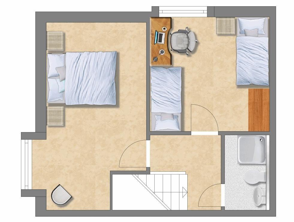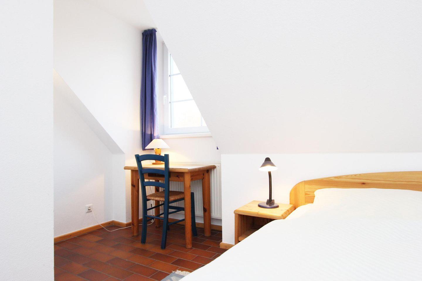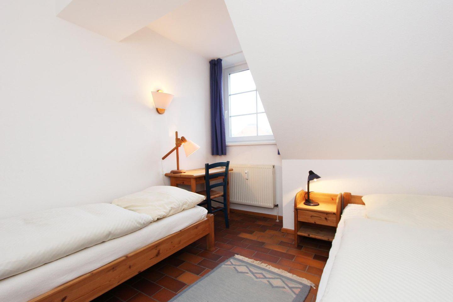 Im hellen Dachgeschoss der Wohnung befinden sich die zwei Schlafzimmer mit je einem Doppelbett und zwei Einzelbetten. Auf dieser Ebene befindet sich das zweite Duschbad mit WC.