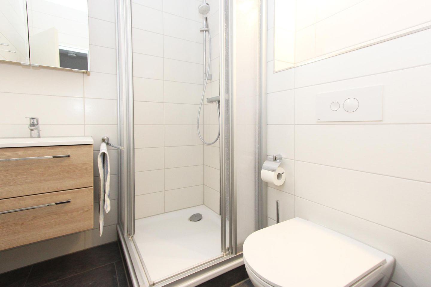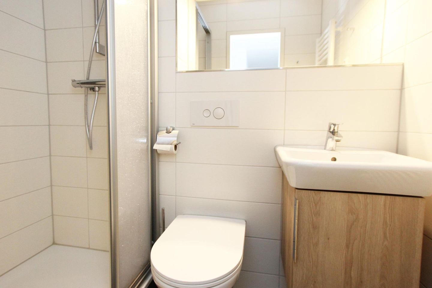 Vom Wohnzimmer aus gelangt man auf den Balkon, welcher nach Westen ausgerichtet ist. Hier lässt es sich ganz entspannt frühstücken oder zu Abend essen. Die gut ausgestattete, moderne Küche und der Esstisch befinden sich angrenzend zum Wohnzimmer. Auf dieser Etage befindet sich auch ein Duschbad mit WC.