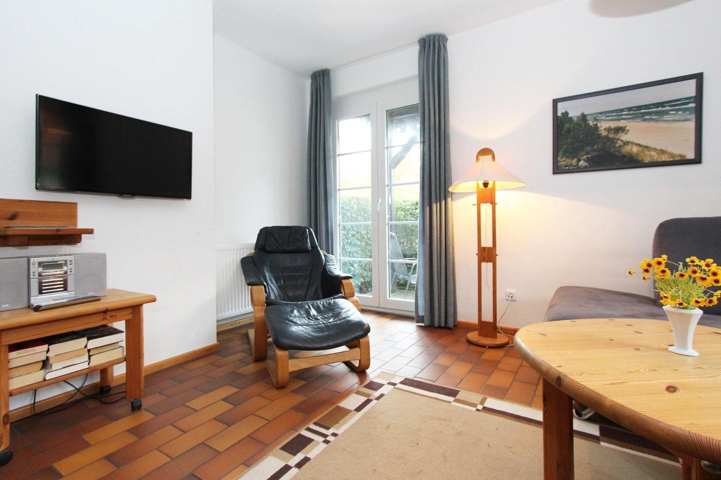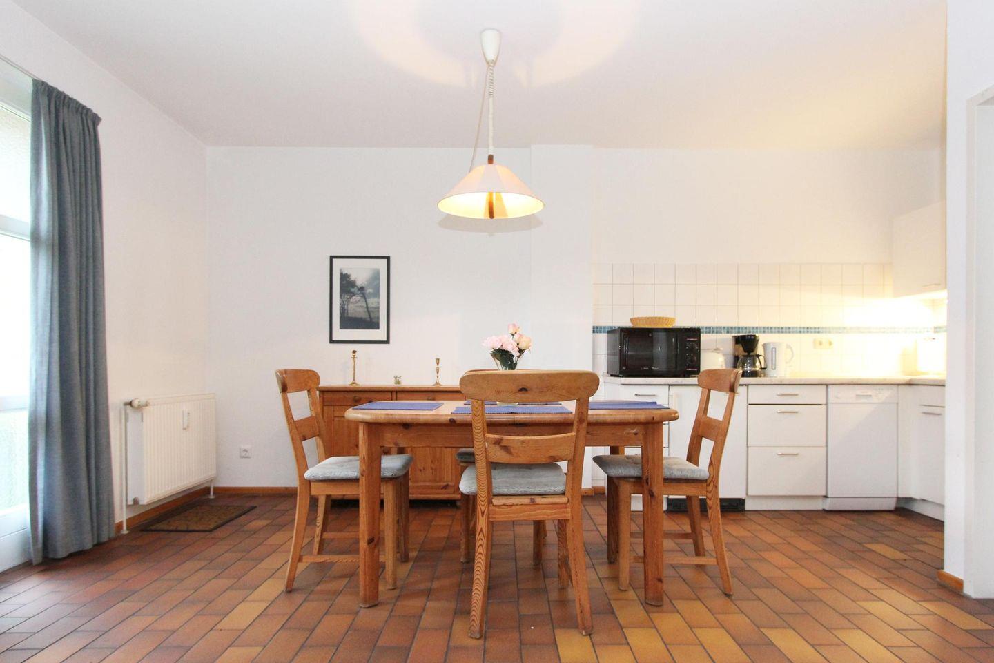 Durch die ortstypische Darßer Haustür gelangen Sie in das helle Wohnzimmer und den großen Essbereich der Wohnung mit der gut ausgestatteten, angrenzenden Küche. Über die Terrassentür betreten Sie die schöne Holzterrasse mit entspanntem Blick in den gepflegten Garten, welcher liebevoll durch die Eigentümer angelegt wurde.