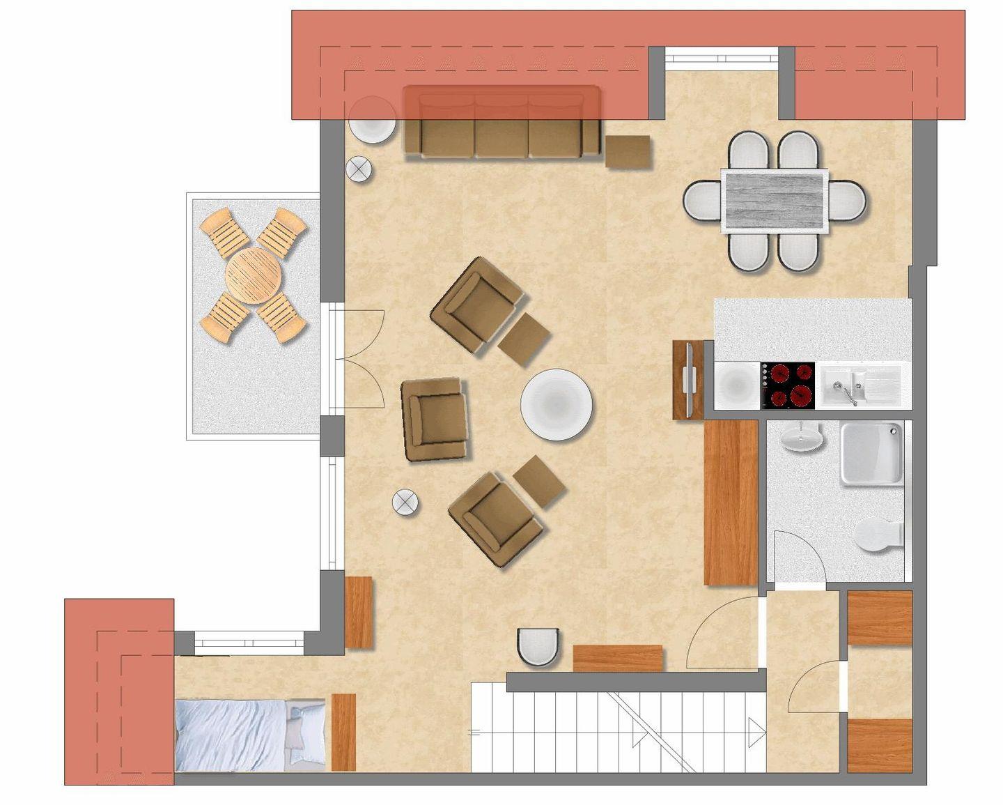 Die Maisonettewohnung im 1. Stock und im Dachgeschoss liegend, hat ein sehr geräumiges und helles Wohnzimmer mit Fernsehcouch und gemütlichen Schwingsesseln.