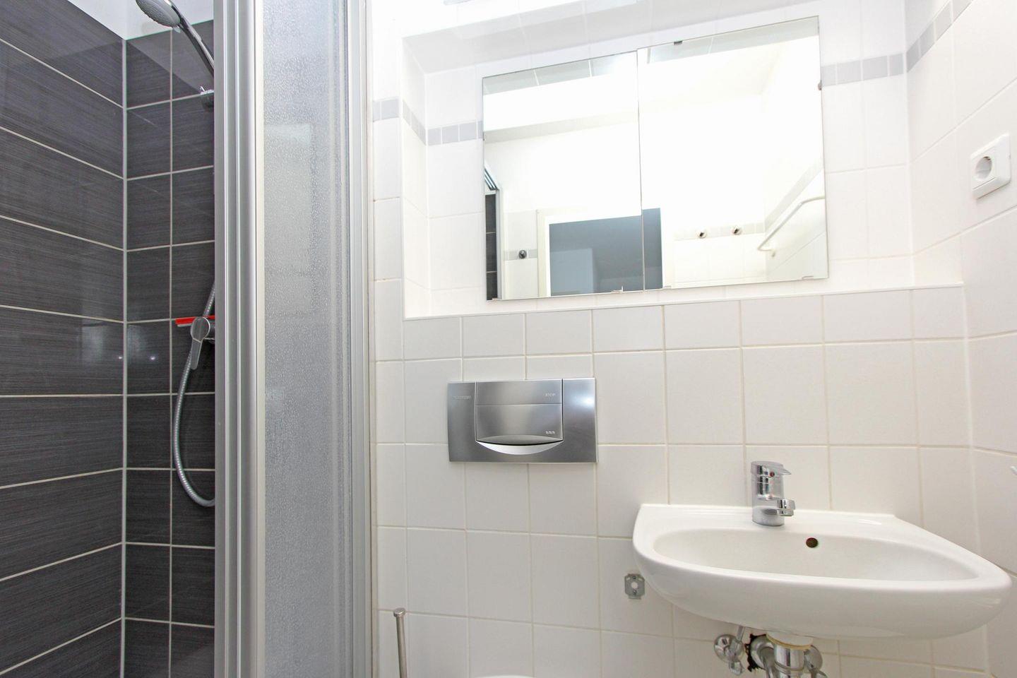 Vom Wohnzimmer aus gelangt man auf den Balkon, der Nachmittags und Abends von der Sonne beschienen ist. Hier lässt es sich ganz entspannt frühstücken oder zu Abend essen. Die gut ausgestattete, moderne Küche und der Esstisch befinden sich angrenzend zum Wohnzimmer. Auf dieser Etage befindet sich auch ein Duschbad mit WC.