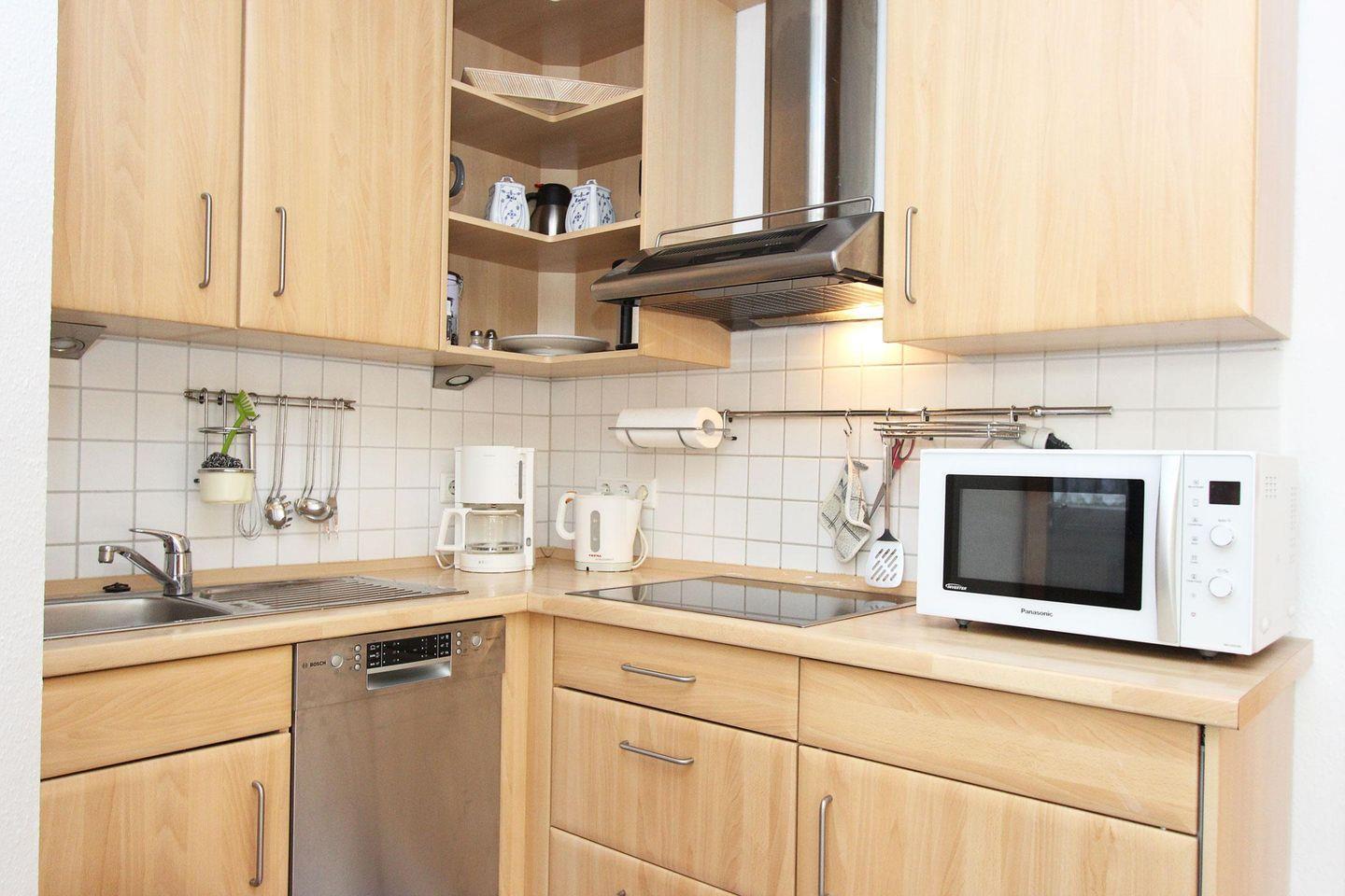 Die offene Küche ist mit einer Ceran-Kochfläche, Spülmaschine, Mikrowelle, Kühlschrank mit Gefrierfach und eine Kaffeemaschine ausgestattet. Der angrenzende Esstisch bietet genügend Platz für gemeinsame Mahlzeiten mit Freunden oder der Familie.