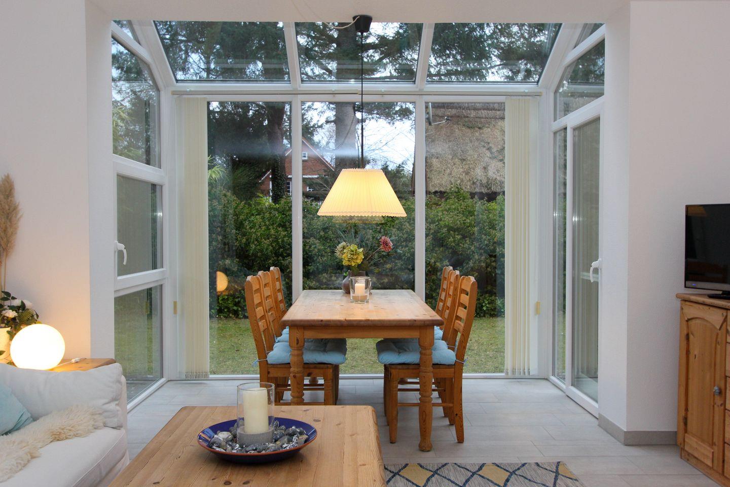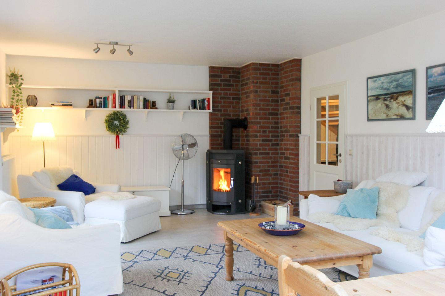 Für einen erholsamen Urlaub erwarten Sie im Erdgeschoss des Hauses ein großer, offener Wohnbereich mit gemütlicher Fernsehcouch, Sitzplätzen zum Lesen an einem Kaminofen und ein großer Esstisch im angrenzenden Wintergarten. Der Internetfähige Fernseher lässt keine Wünsche offen.