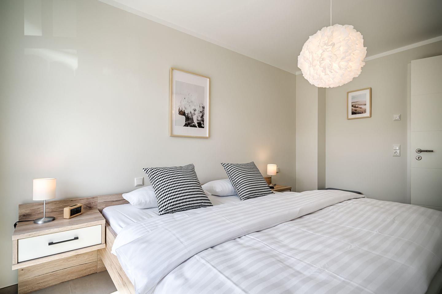 1 Schlafzimmer mit Doppelbett (1,80 x 2,00m), verstellbare Lattenroste, TV, mit Zugang zur Dachterrasse