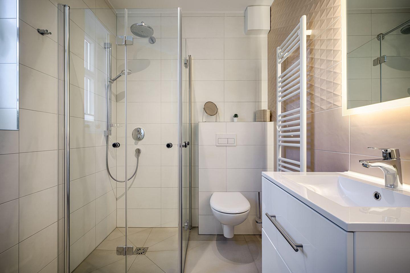 Tageslichtbad mit ebenerdiger Dusche und anliegender Sauna (ohne Gebühr)