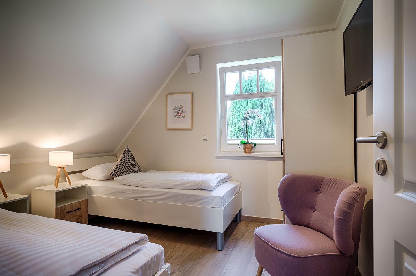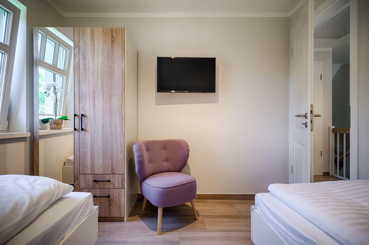 1 Schlafzimmer mit 2 Einzelbetten (0,90 x 2,00m) mit verstellbaren Lattenrosten, TV