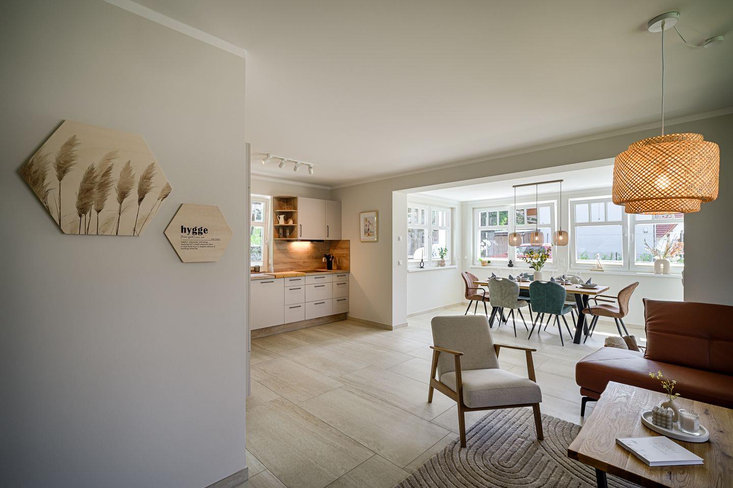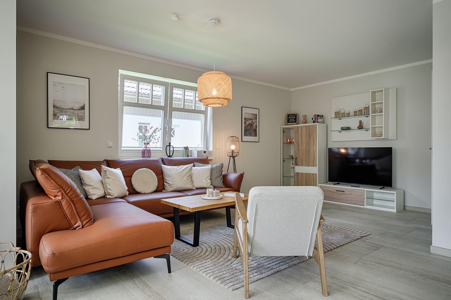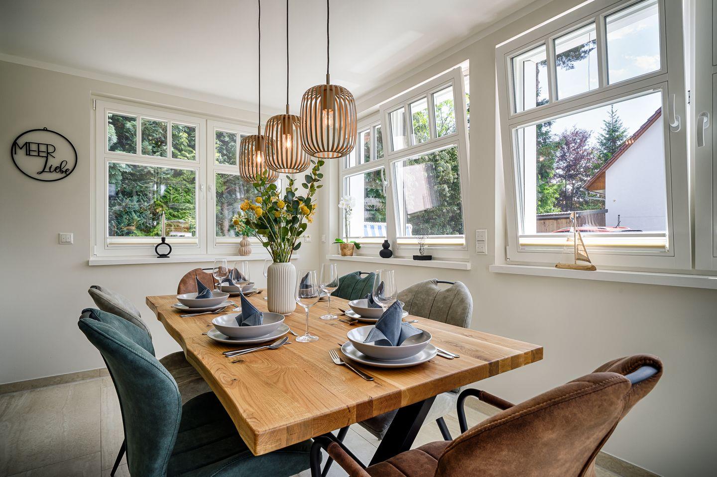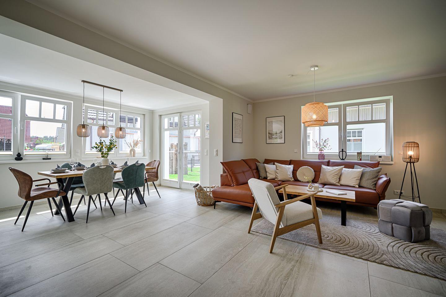Wohnraum mit Ledersofa, Wintergarten mit Esstisch für 6 Personen