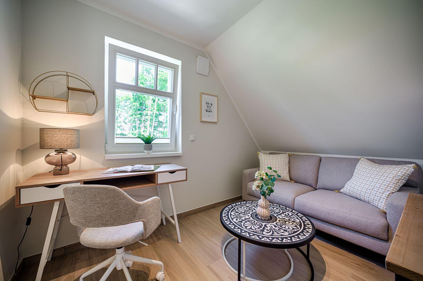1 Zimmer mit Couch und Schreibtisch