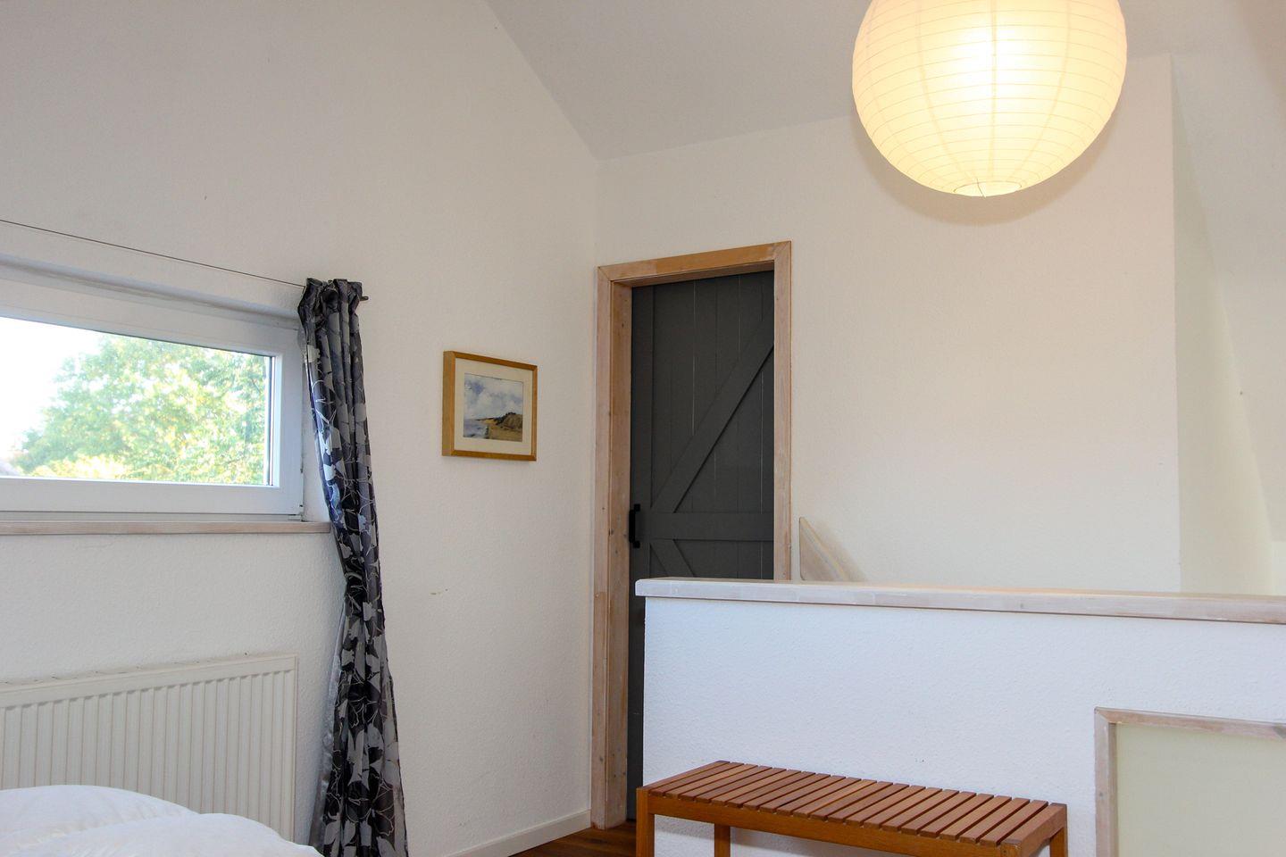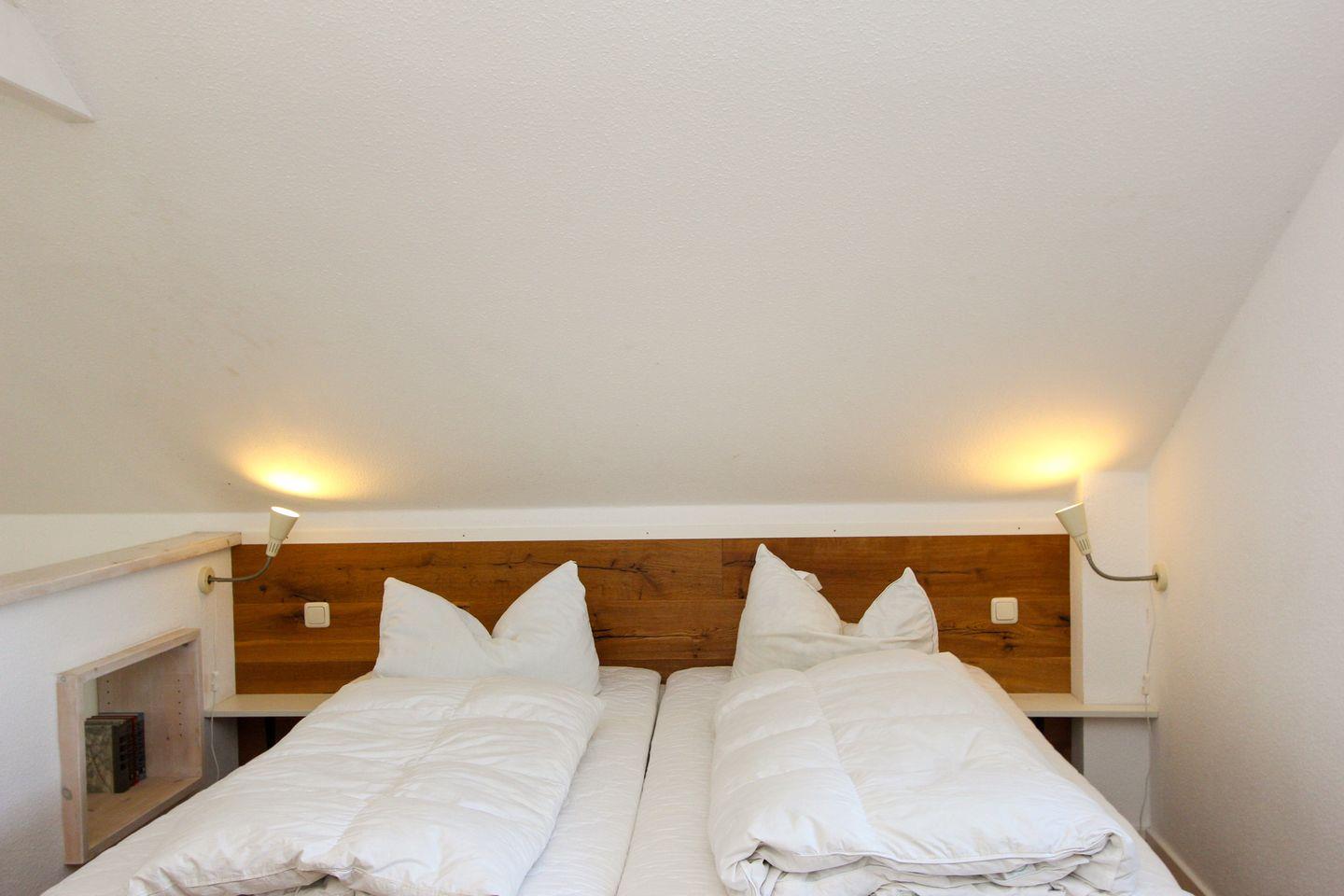 Die helle und einladende Wohnung verfügt über einen Schlafbereich mit Doppelbett auf offener Galerie. Der offene Wohnbereich ist der zentrale Treffpunkt und kombiniert eine Sofaecke mit einem Essbereich, perfekt für gemeinsame Mahlzeiten oder Spieleabende. Hier genießen Sie auch den Zugang zur eigenen Terrasse, die mit Gartenmöbeln ausgestattet ist.