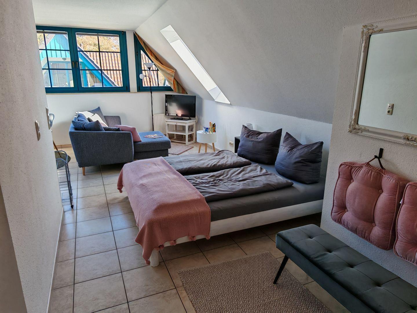 Willkommen in unserer 36 m² großen 1-Zimmer-Ferienwohnung (ehemals "Merle")! Die offene Küche bietet modernen Komfort. Entspannen Sie auf dem gemütlichen Sofa vor dem TV. Das Tageslichtbad sorgt für eine helle Atmosphäre. Das Doppelbett lädt zu erholsamen Nächten ein. Perfekt für Paare oder Alleinreisende, um die Umgebung zu erkunden und in gemütlicher Atmosphäre zu entspannen.