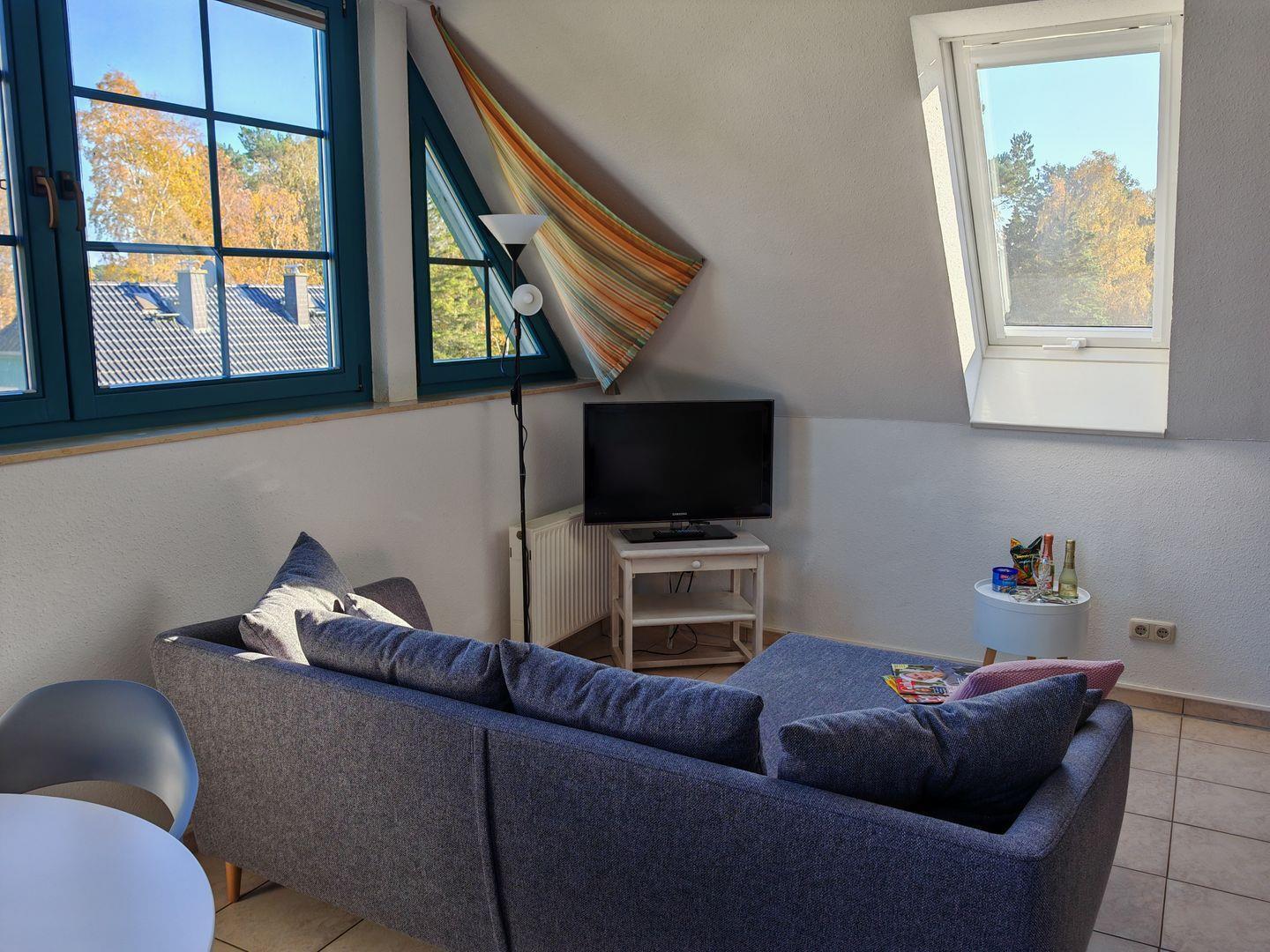 Im Wohnbereich erwartet Sie ein bequemes Sofa, auf dem Sie entspannte Stunden verbringen können. Der Flachbild-TV sorgt für Unterhaltung und ist ideal, um sich nach einem ereignisreichen Tag zu entspannen.