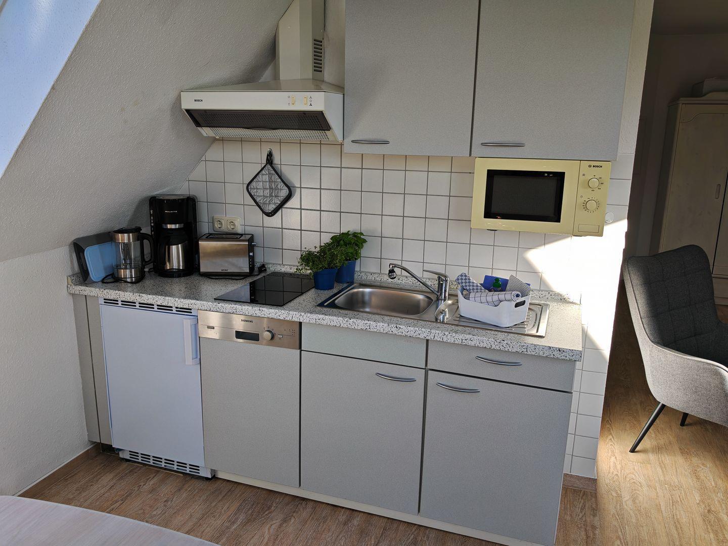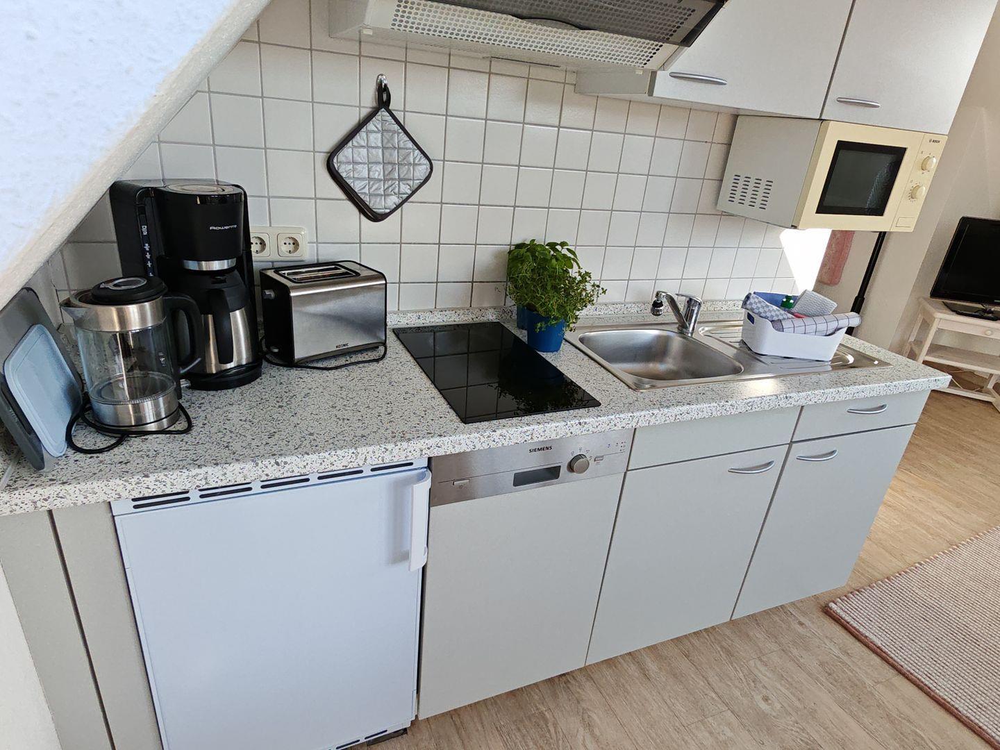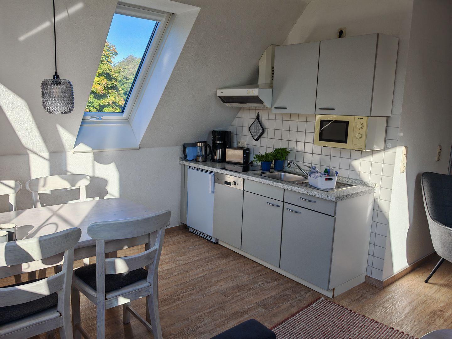 Die offene Küche ist modern und komplett ausgestattet, um Ihren kulinarischen Vorlieben gerecht zu werden. Ein geräumiges Sofa und ein gemütlicher Sessel im Wohnbereich schaffen eine behagliche Atmosphäre. Hier können Sie sich nach einem ereignisreichen Tag entspannen oder in geselliger Runde zusammenkommen.