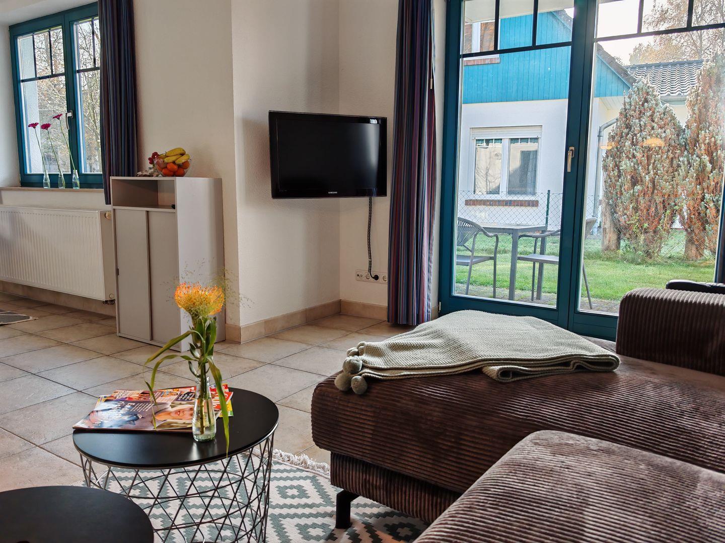 Der große Esstisch lädt dazu ein, gemeinsame Mahlzeiten in gemütlicher Runde zu genießen. Der Wohnbereich ist mit einem komfortablen Sofa, einem Sessel und einem TV ausgestattet, um Ihnen entspannte Stunden zu ermöglichen.