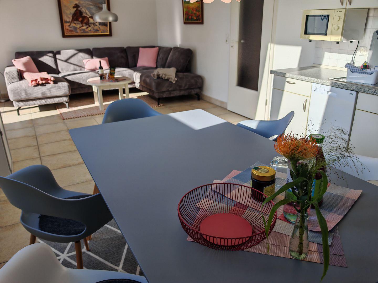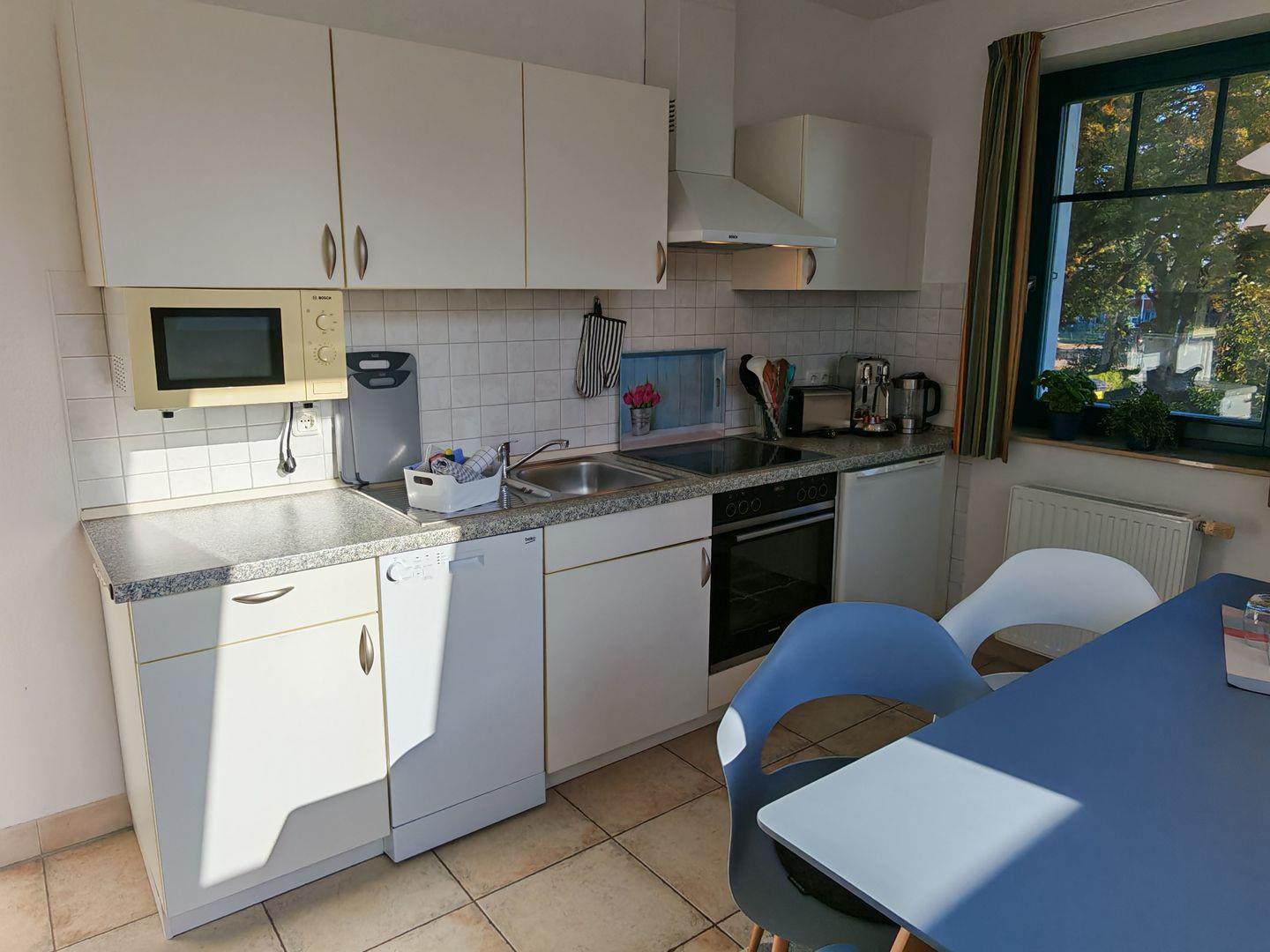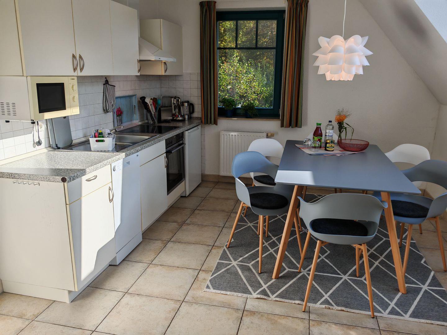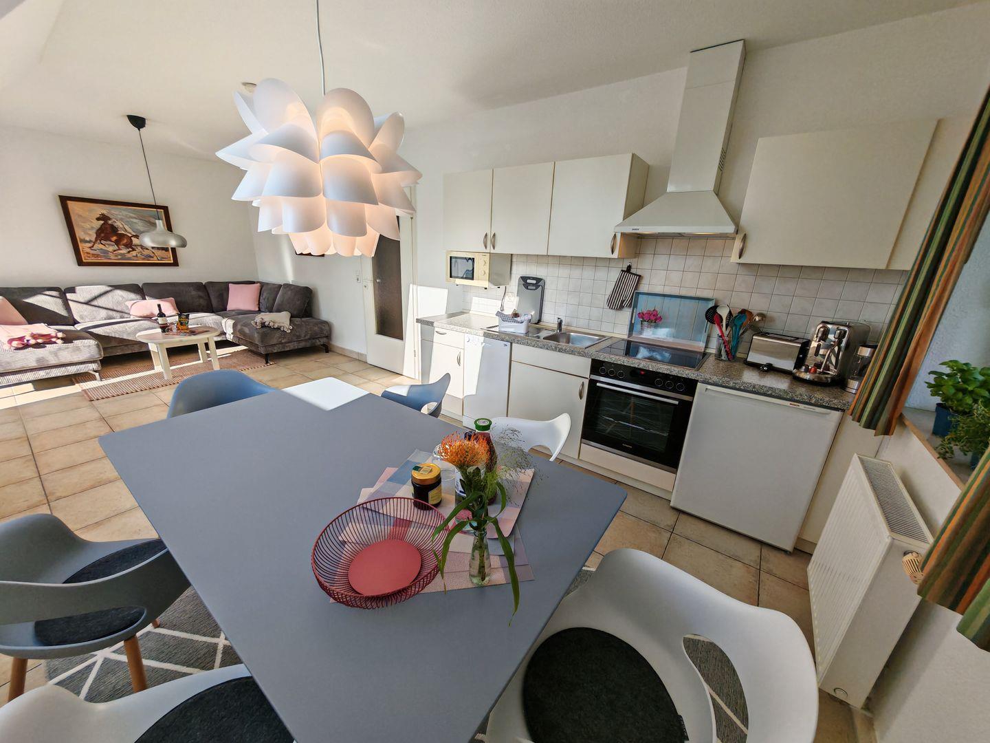 Die offene Küche ist modern und komplett ausgestattet, um Ihren kulinarischen Vorlieben gerecht zu werden. Die schöne Essecke bietet einen einladenden Raum für gemeinsame Mahlzeiten und geselliges Beisammensein. Der Wohnbereich ist mit einem komfortablen Sofa, einem Sessel und einem Flachbild-TV ausgestattet, um Ihnen entspannte Stunden zu ermöglichen.