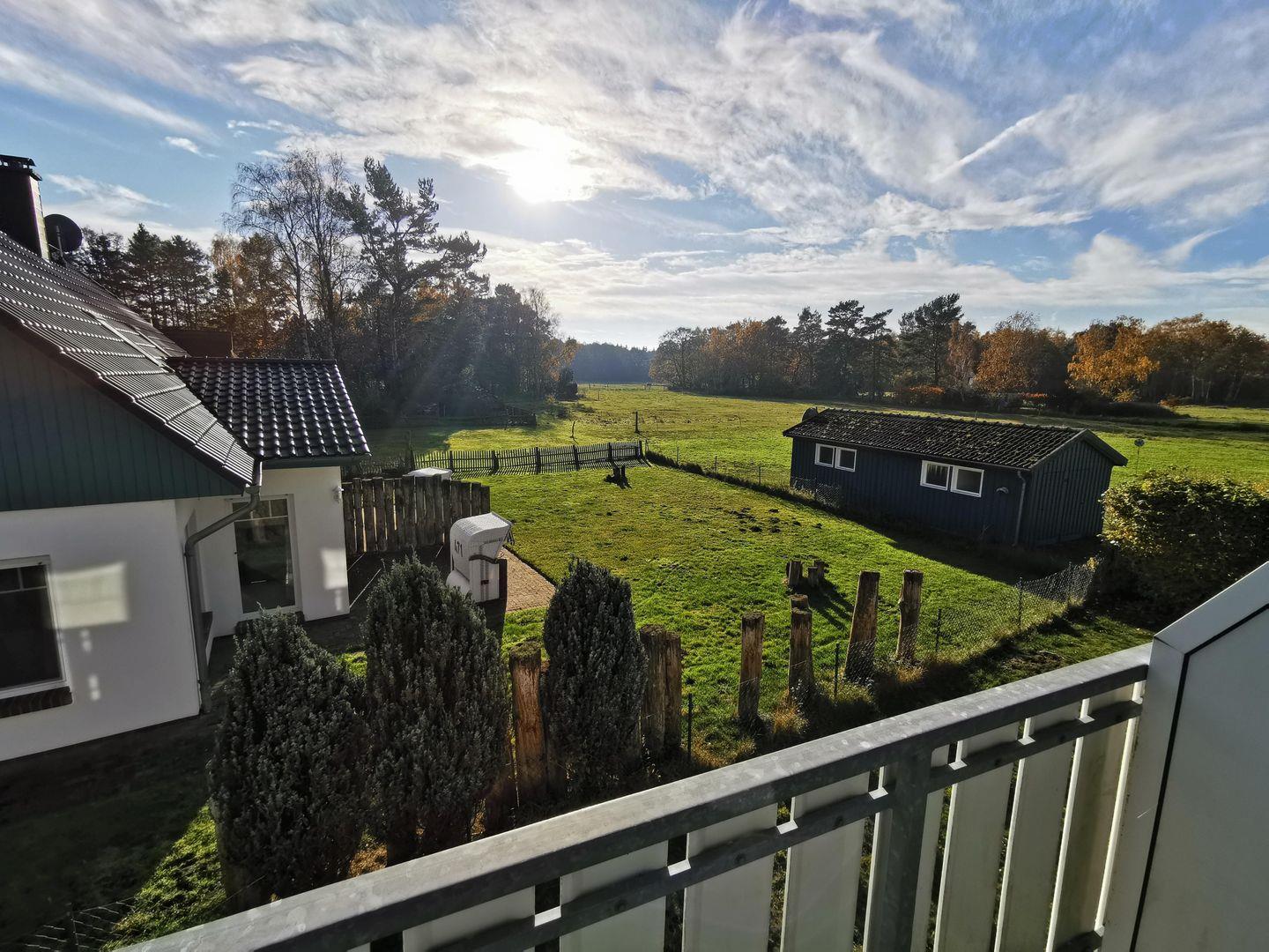 Der Südbalkon eröffnet einen malerischen Blick auf eine grüne Wiese und den umliegenden Wald. Hier können Sie bei einem Glas Wein die Natur genießen oder den Tag mit einer Tasse Kaffee in der Sonne beginnen.