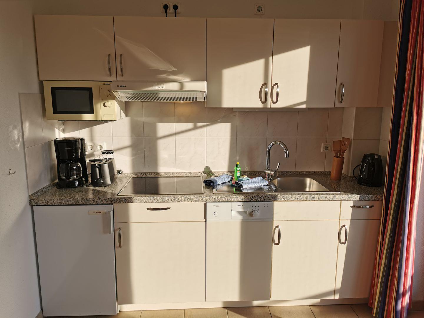 Die offene Küche ist modern und komplett ausgestattet, um Ihren Aufenthalt so angenehm wie möglich zu gestalten. Hier können Sie gemeinsam kochen und die Mahlzeiten am Esstisch genießen, der sich harmonisch in das Gesamtbild einfügt.