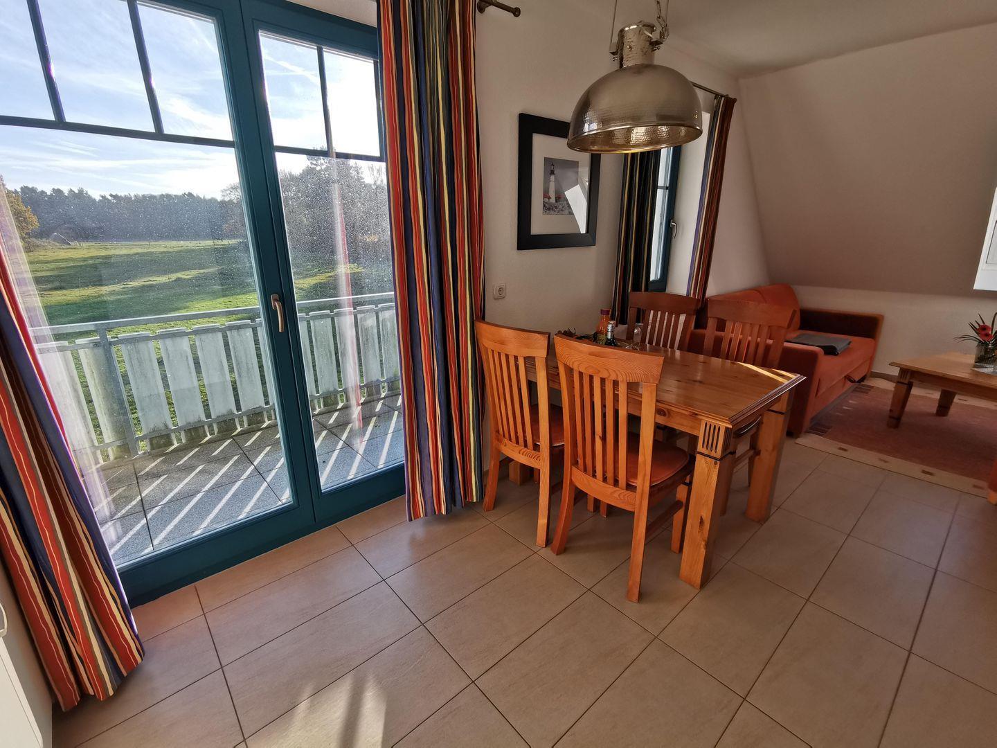 Der Südbalkon, mit einem unverbaubaren Blick auf eine grüne Wiese und den Darßer Wald, ist ein Highlight dieser Wohnung. Hier können Sie die Sonne genießen, den Vögeln lauschen und die Natur in vollen Zügen erleben.