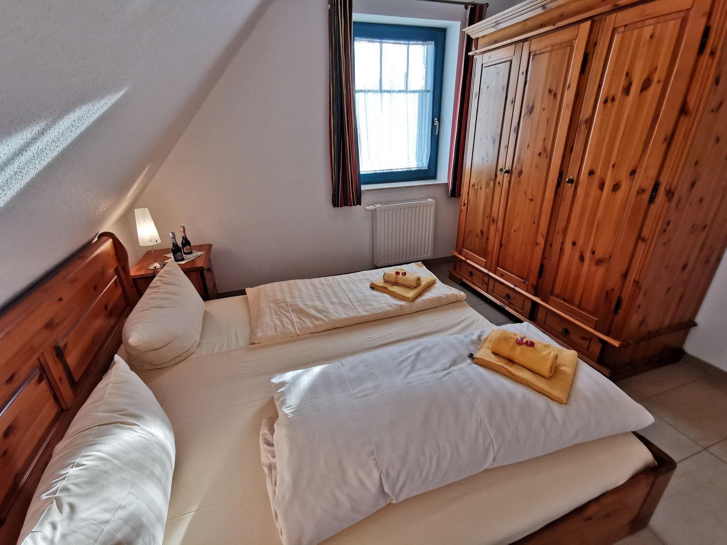 Die gesamte Wohnung sowie das Schlafzimmer ist mit Massivholzmöbeln eingerichtet und schafft eine warme und behagliche Atmosphäre. Hier können Sie sich zurückziehen und erholsame Nächte verbringen.