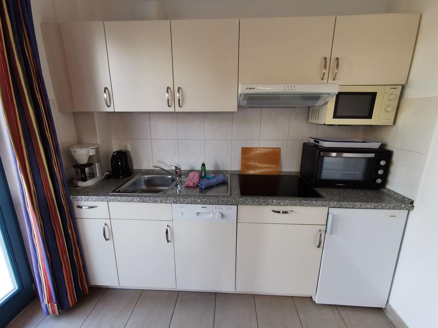 Die offene Küche ist modern ausgestattet und lädt dazu ein, gemeinsam zu kochen und zu speisen. Der Wohnbereich überzeugt mit einem komfortablen Sofa. Zwei Sessel bieten weitere Sitzgelegenheiten für gemütliche Stunden.