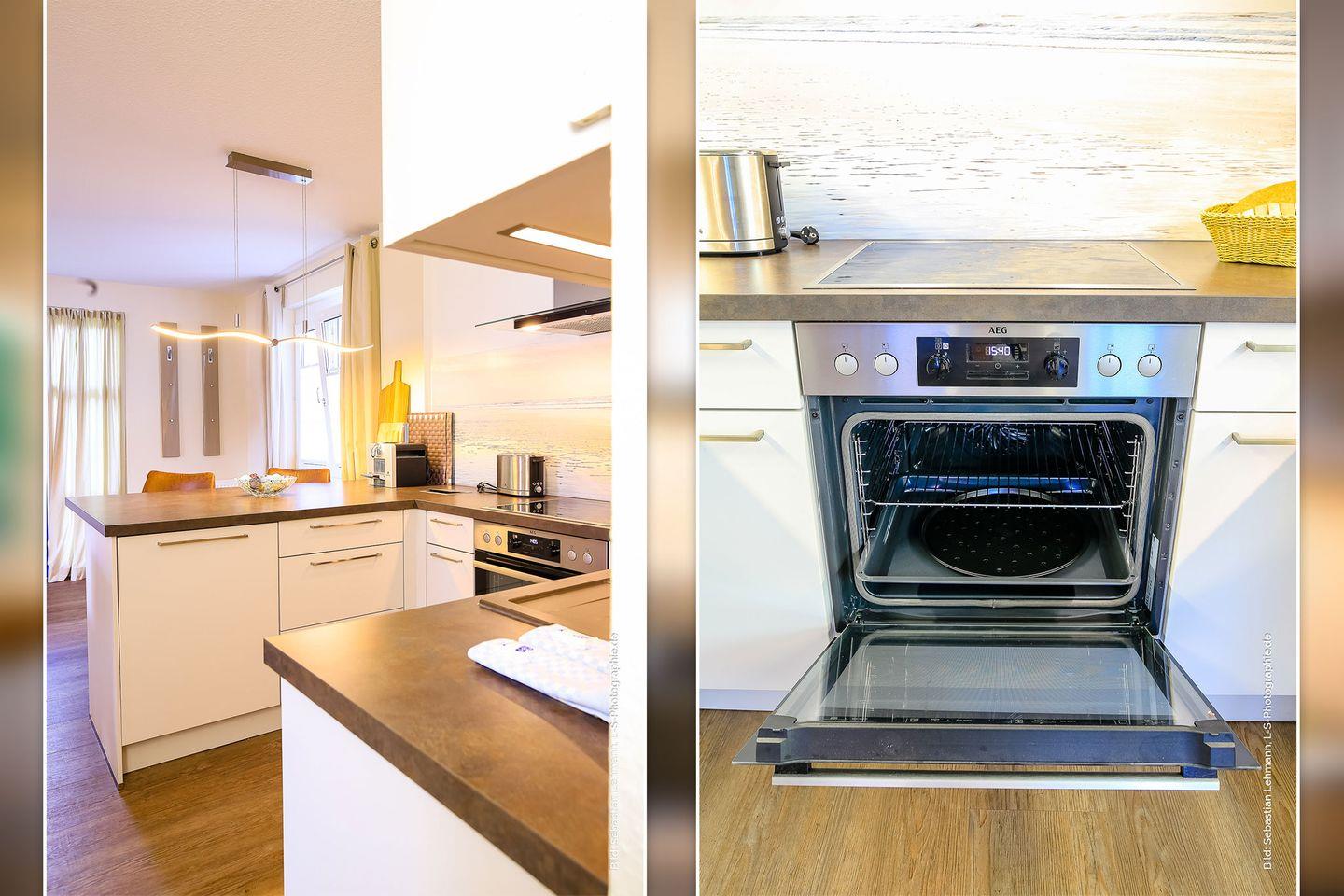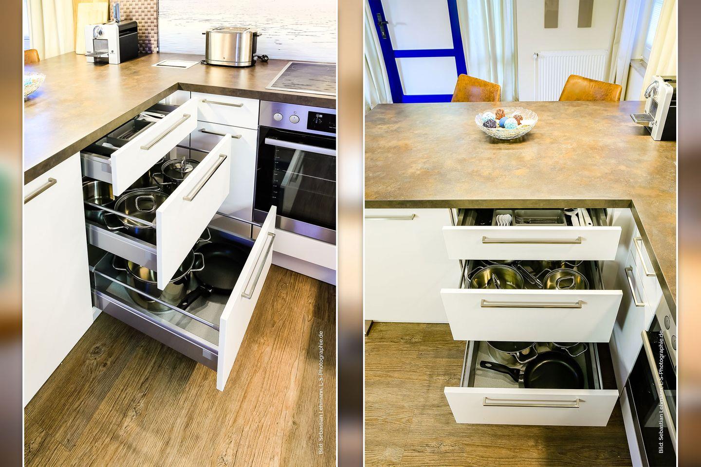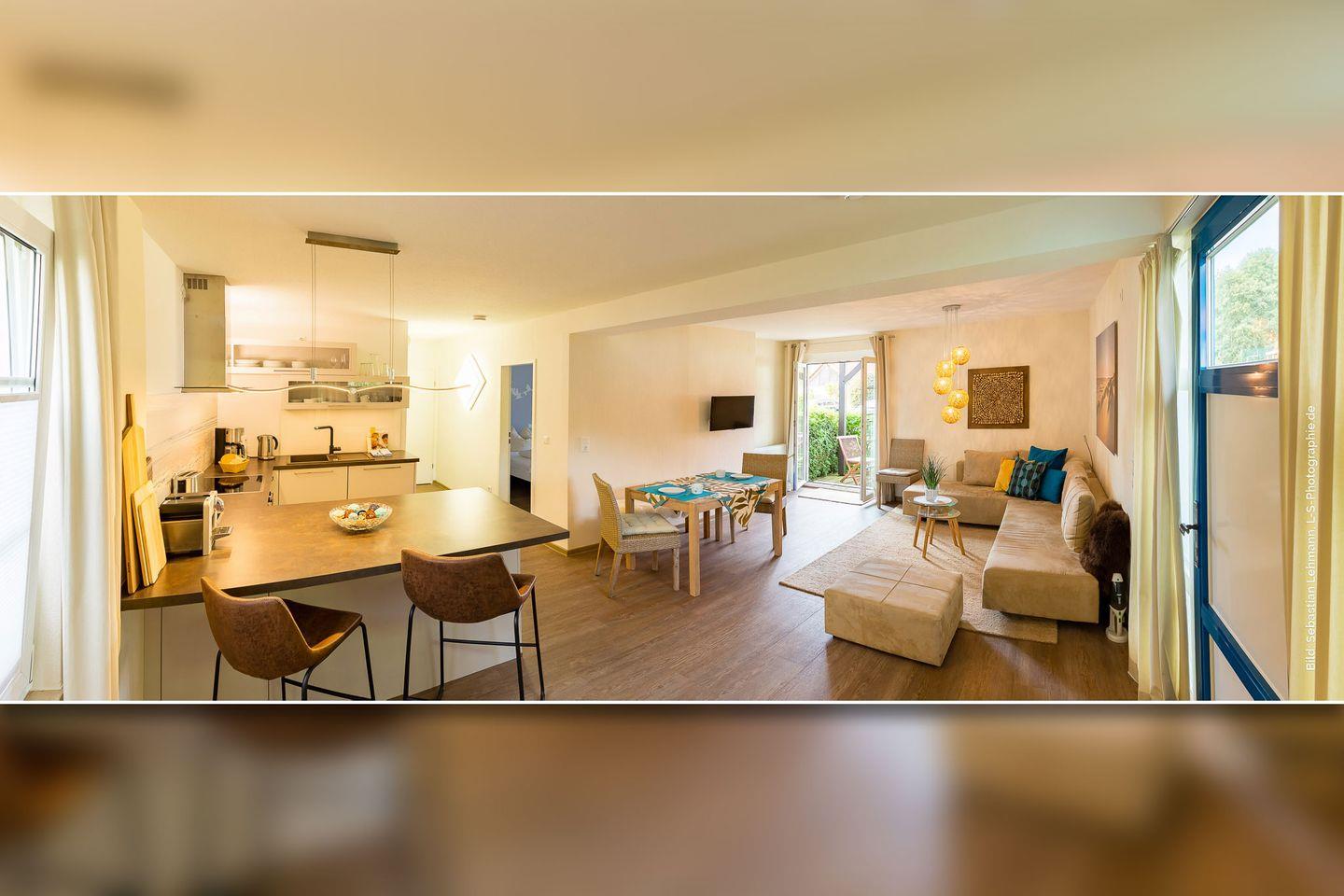 Durch eine ortstypische Darßer Haustür gelangen Sie in den großen Essbereich mit angrenzender Küche und in das helle Wohnzimmer mit ausziehbarer Schlafcouch. Im hinteren Teil der Wohnung befindet sich rechts das großzügige Schlafzimmer, mit gemütlichem Doppelbett, einem Kleiderschrank, einer Kommode sowie einem Stuhl. Auf der gegenüberliegenden Seite befinden sich ein Duschbad mit WC und ein separates Gäste-WC.