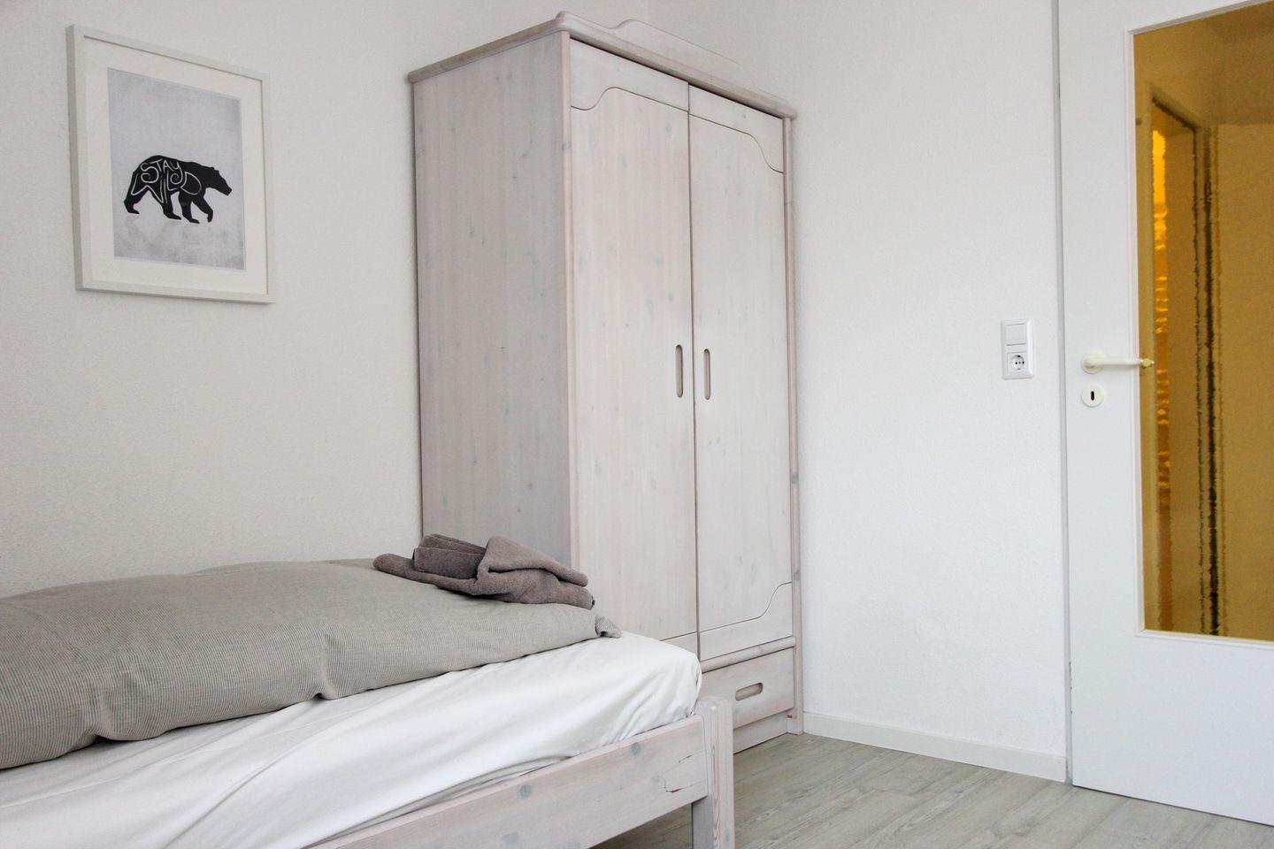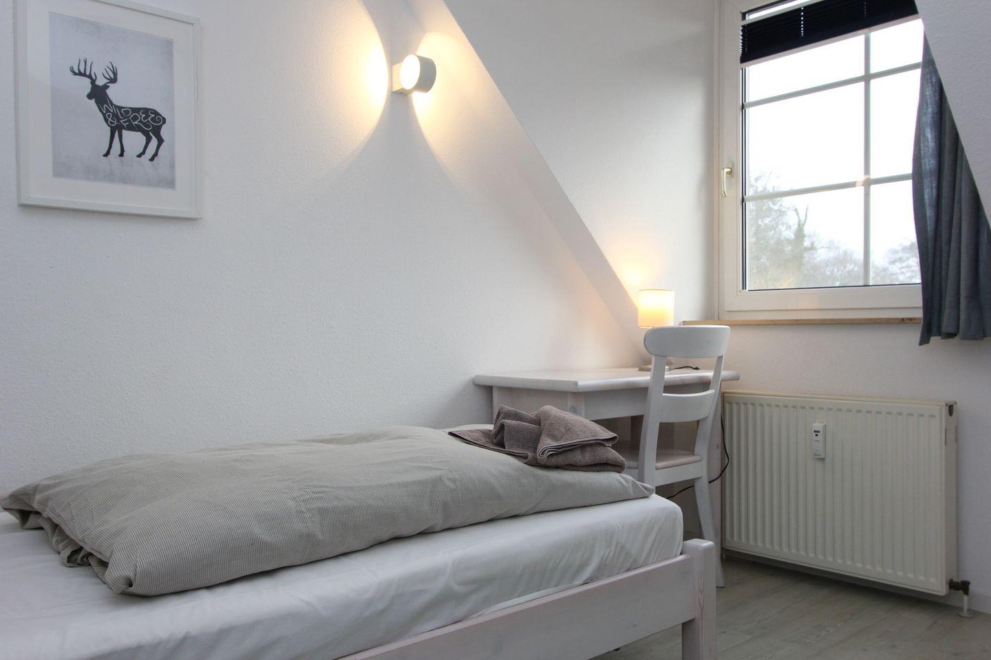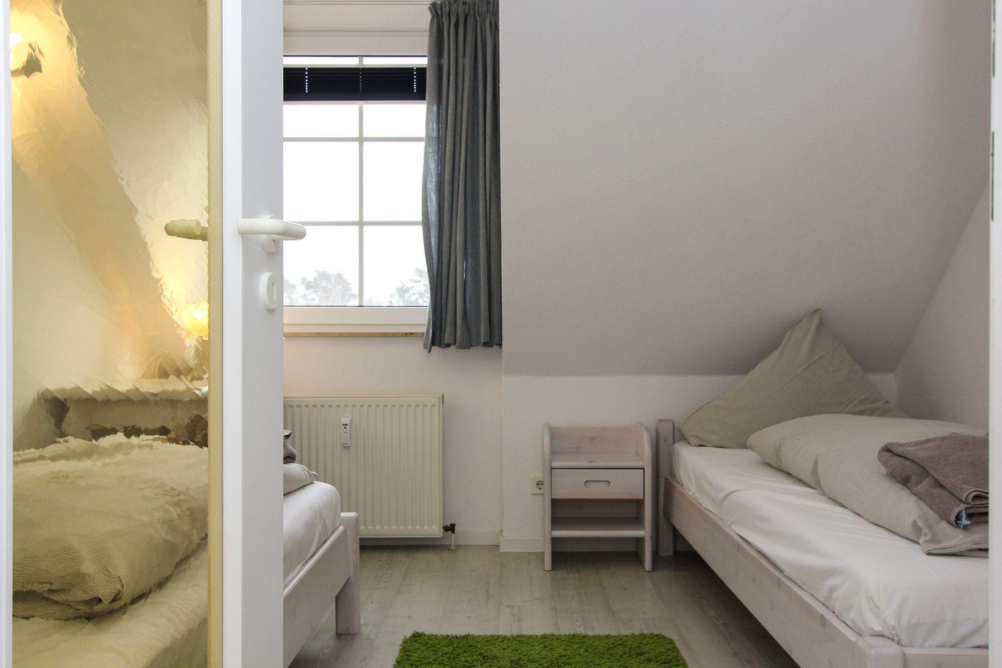 Im hellen Dachgeschoss der Wohnung befinden sich die zwei Schlafzimmer. Eines davon verfügt über ein Doppelbett, das zweite Schlafzimmer verfügt über zwei Einzelbetten. Auf dieser Ebene befindet sich auch das zweite Duschbad mit WC.