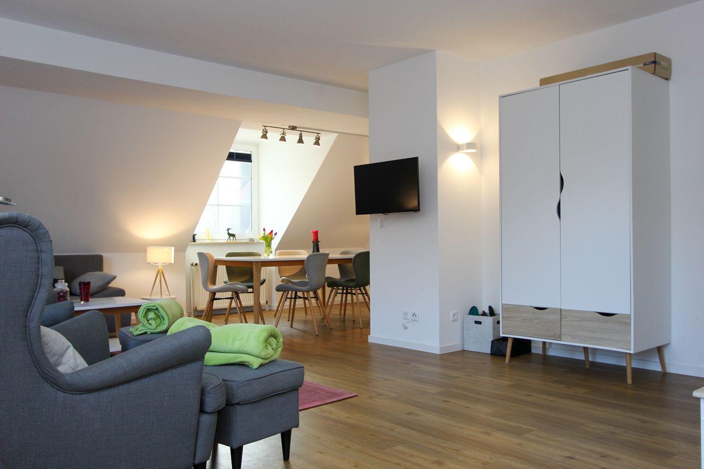 Die Maisonettewohnung erstreckt sich über das Ober- und Dachgeschoss. Die Wohnung hat ein sehr geräumiges und helles Wohnzimmer mit gemütlicher Fernsehcouch und Sesseln.