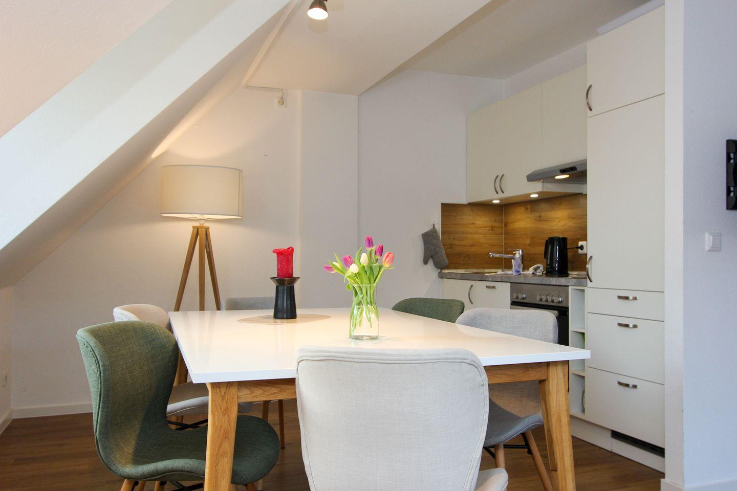 Vom Wohnzimmer aus gelangt man auf den Balkon mit Ostausrichtung, hier lässt es sich ganz entspannt frühstücken oder zu Abend essen. Die gut ausgestattete, moderne Küche und der Esstisch befinden sich angrenzend zum Wohnzimmer. Auf dieser Etage befindet sich auch ein Duschbad mit WC.