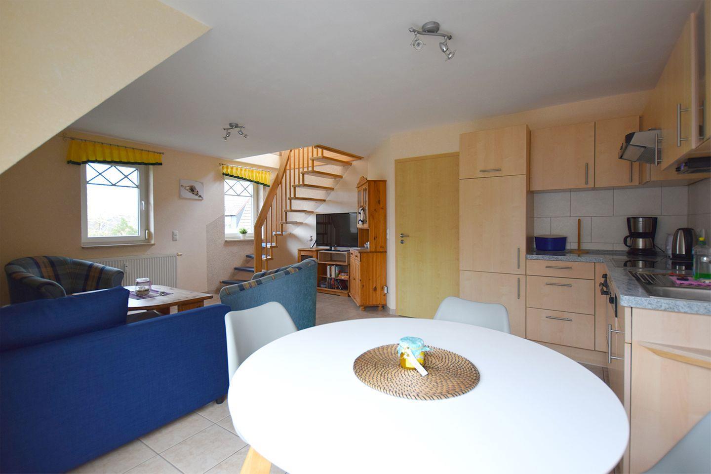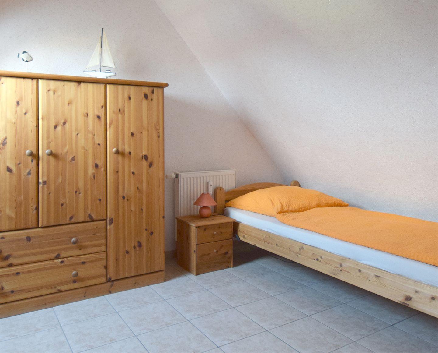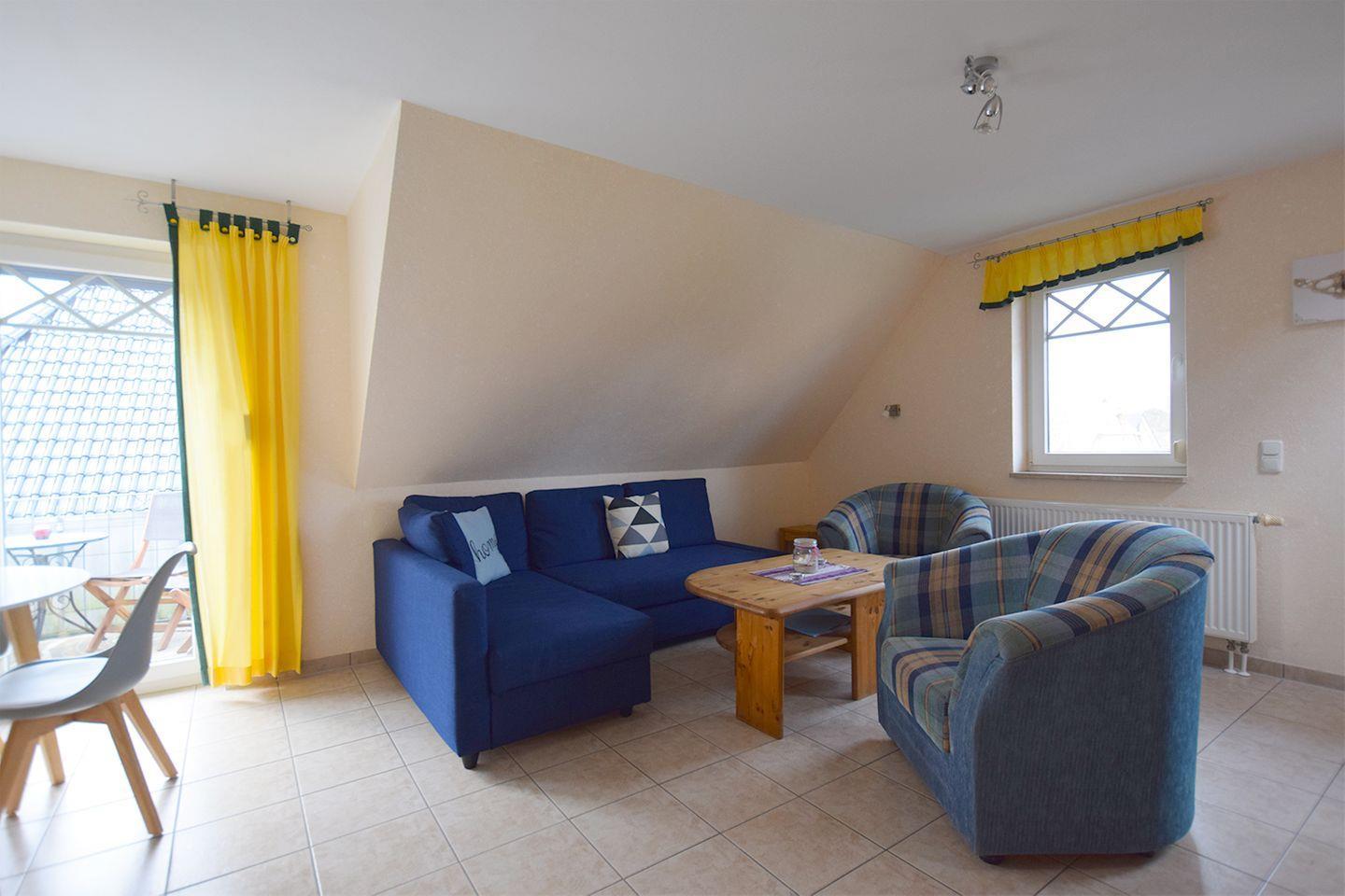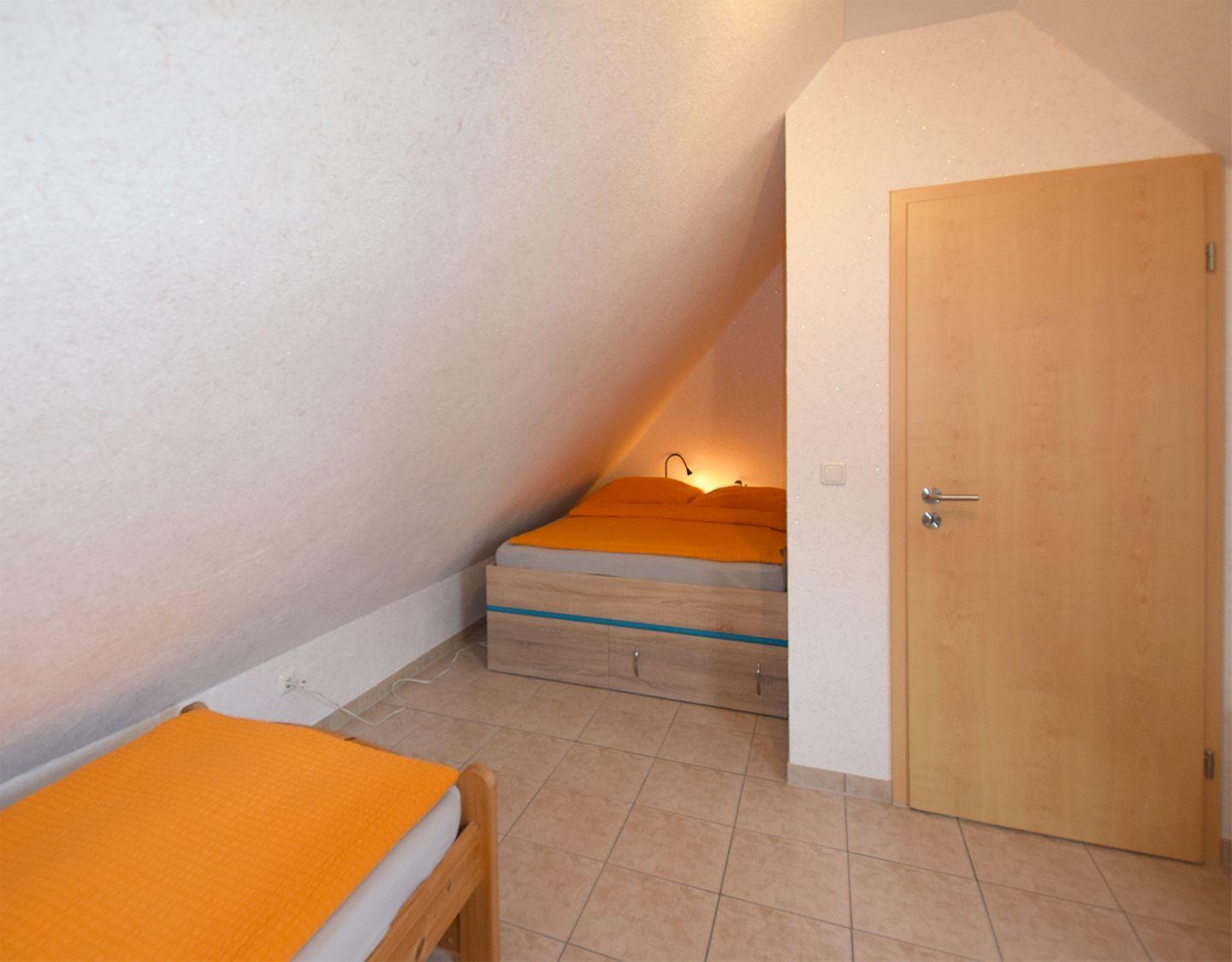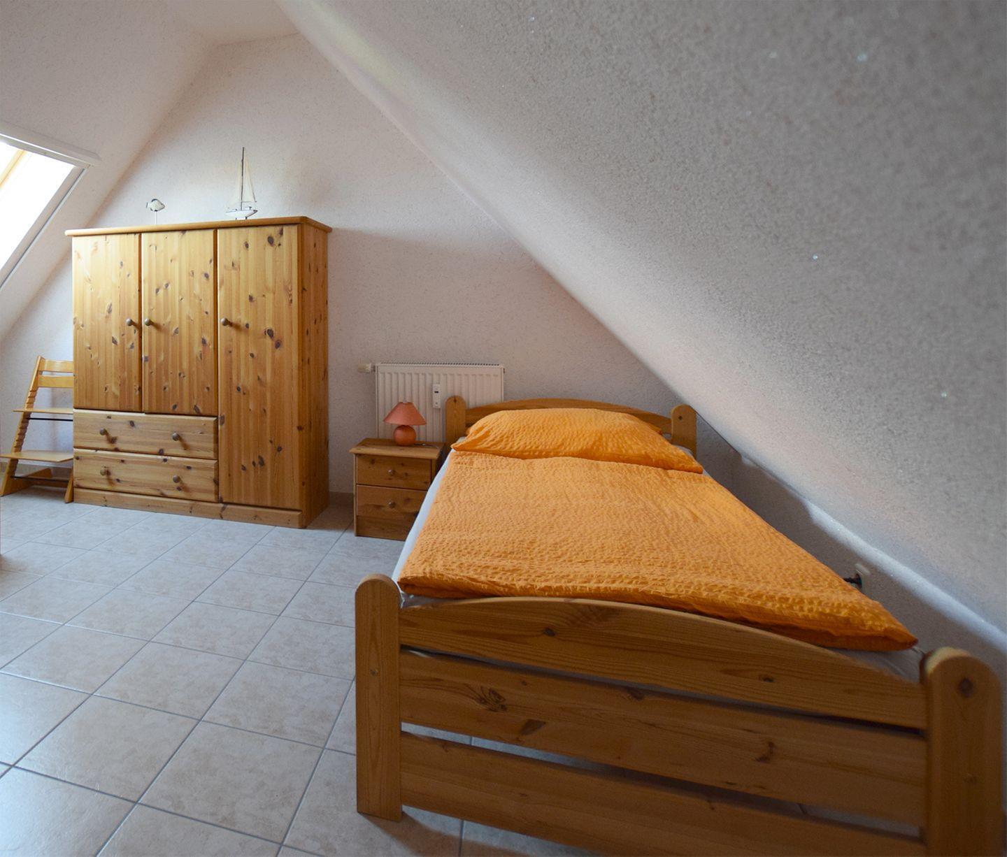 Diese gemütliche Ferienwohnung bietet auf ca. 64 m² Wohnfläche Platz für bis zu 4 Personen. Sie befindet sich im Obergeschoss und verfügt über einen geräumigen Wohnbereich mit Essbereich, einem Flur, einer gut ausgestatteten Küche und einem Bad. Im Obergeschoss finden Sie zudem ein Schlafzimmer mit einem Doppelbett (180 x 200 cm). Im Dachgeschoss befindet sich ein weiteres Schlafzimmer, das mit einem Einzelbett (90 x 200 cm) sowie einem französischen Bett (140 x 200 cm, durchgehende Matratze) ausgestattet ist.