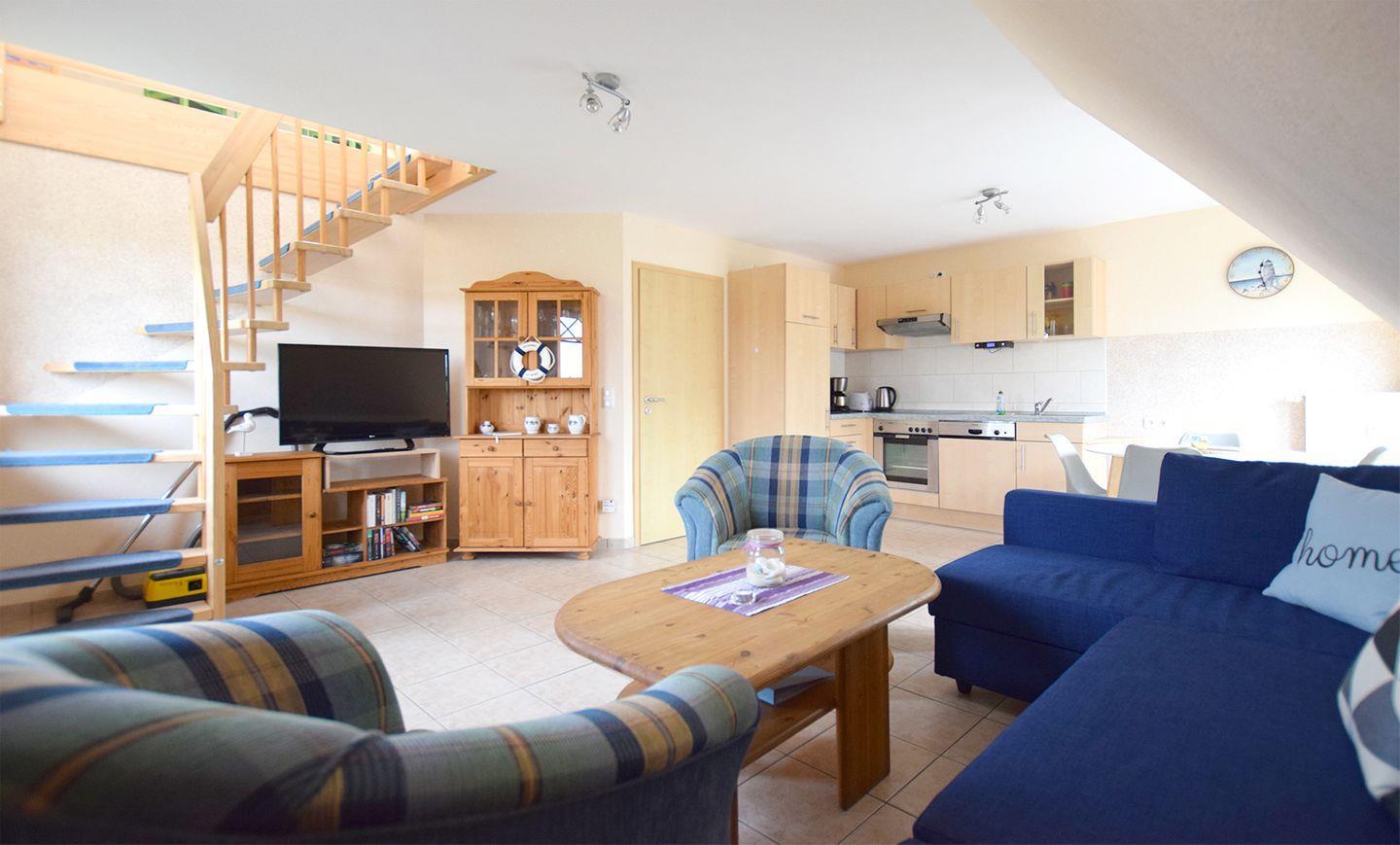 Ferienwohnung bis 4 Personen | ca. 64 m2 Wohnfläche | OG Wohnzimmer mit Essbereich, Flur, Küche, Bad, 1 Schlafzimmer | DG 1 Schlafzimmer | Süd-West-Balkon | 1 Parkplatz | Wohnbereich Sitzgarnitur, Flachbild TV SAT | Küche Esstisch, Backofen, Ceran-Herd, Geschirrspüler, Kaffeemaschine, Kühlschrank mit Gefrierfach, Toaster, Wasserkocher, Radio | Bad mit Dusche, WC | 2 Schlafzimmer SZ OG mit 1 Doppelbett (180 x 200 cm), SZ DG mit 1 Einzelbett (90 x 200 cm) und 1 franz. Bett (140 x 200 cm) | Spielecke auf der Galerie | Fliegengitter, WLAN, Balkon mit Sitzmöbeln und Sonnenschirm, Kinderhochstuhl, Reisebett, gemeinschaftliche Nutzung von Waschmaschine und Trockner
