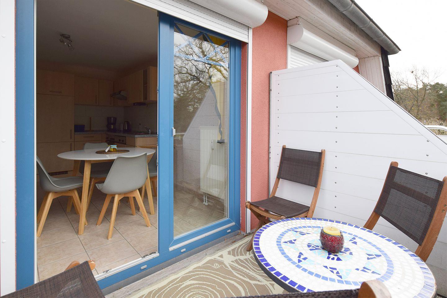 Der Süd-West-Balkon ist mit Sitzmöbeln und einem Sonnenschirm ausgestattet, sodass Sie die Sonne in vollen Zügen genießen können.