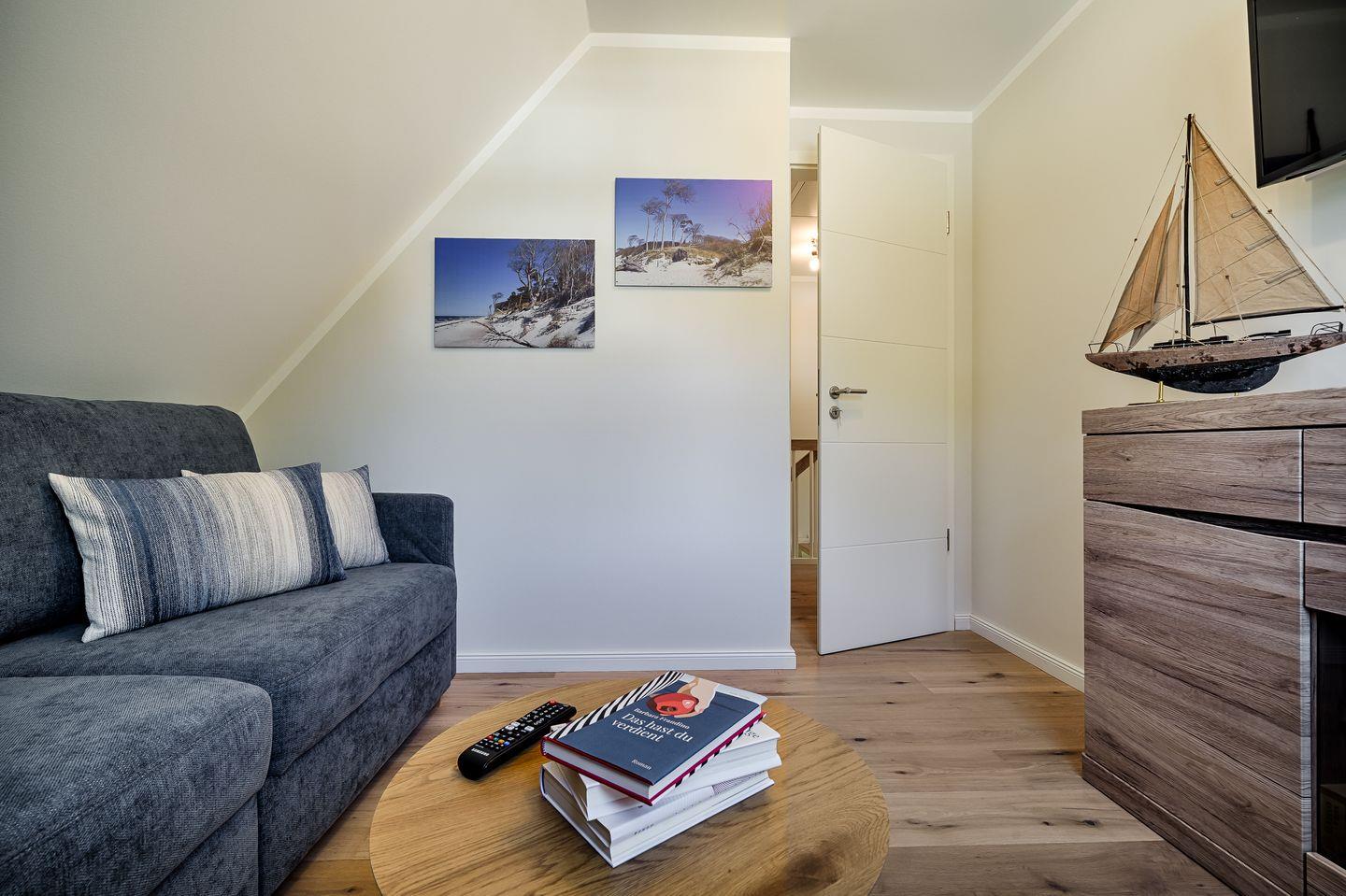 1 Zimmer mit Couch, TV, kleine Bibliothek