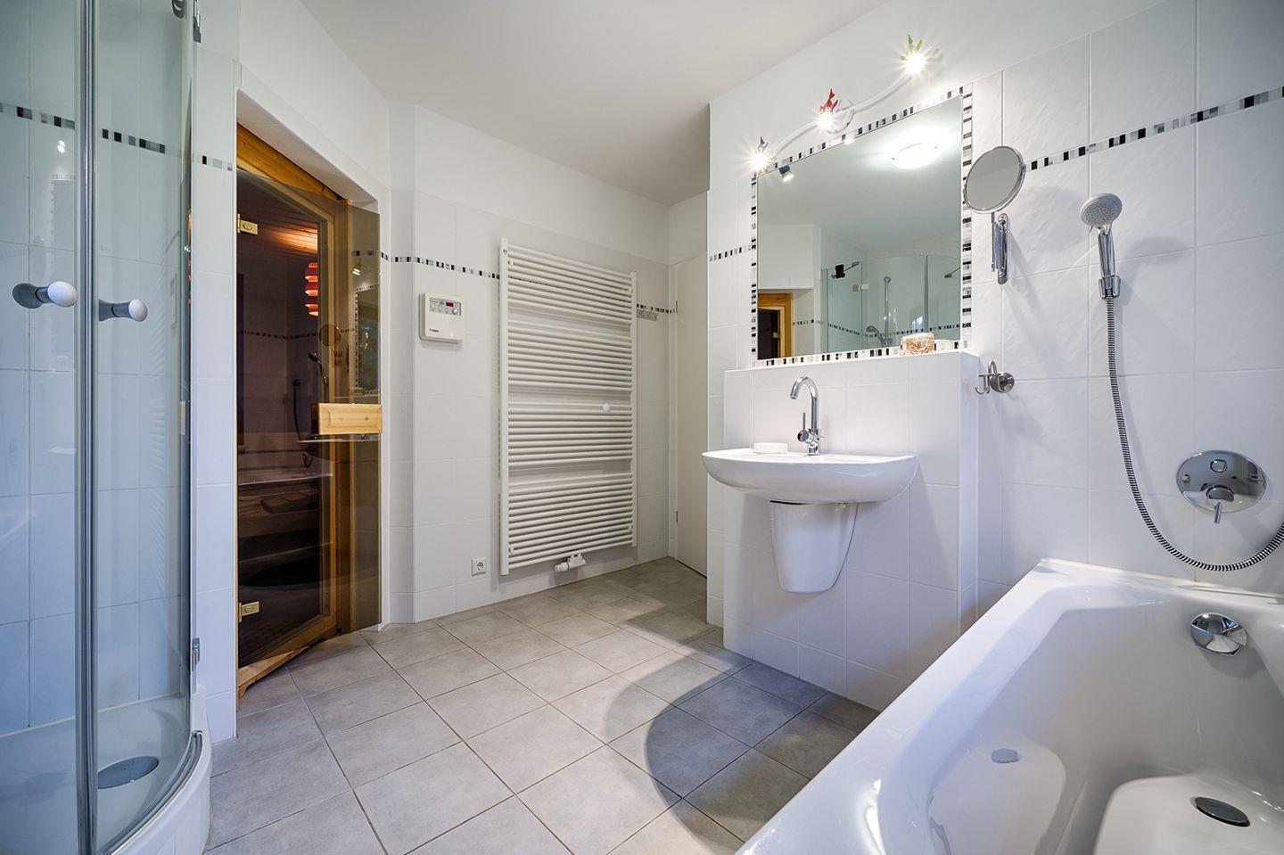 Die moderne Küche ist komplett ausgestattet mit einem Backofen, Geschirrspüler, E-Herd (Cerankochfelder), Kaffeemaschine, Kühlschrank mit Gefrierfach, Toaster, Mikrowelle und Wasserkocher, sodass Sie Ihre Lieblingsgerichte problemlos zubereiten können. Das Badezimmer bietet Ihnen sowohl eine Dusche als auch eine Badewanne, WC, Bidet und sogar eine Sauna für entspannende Momente nach einem erlebnisreichen Tag.