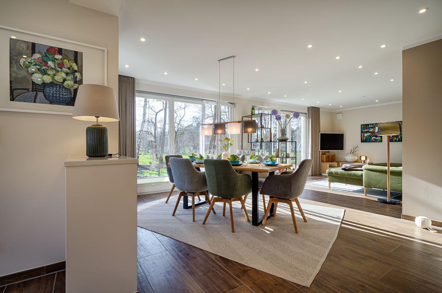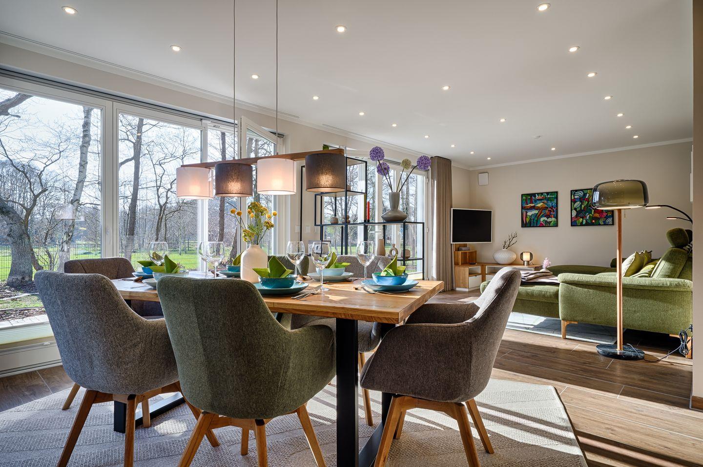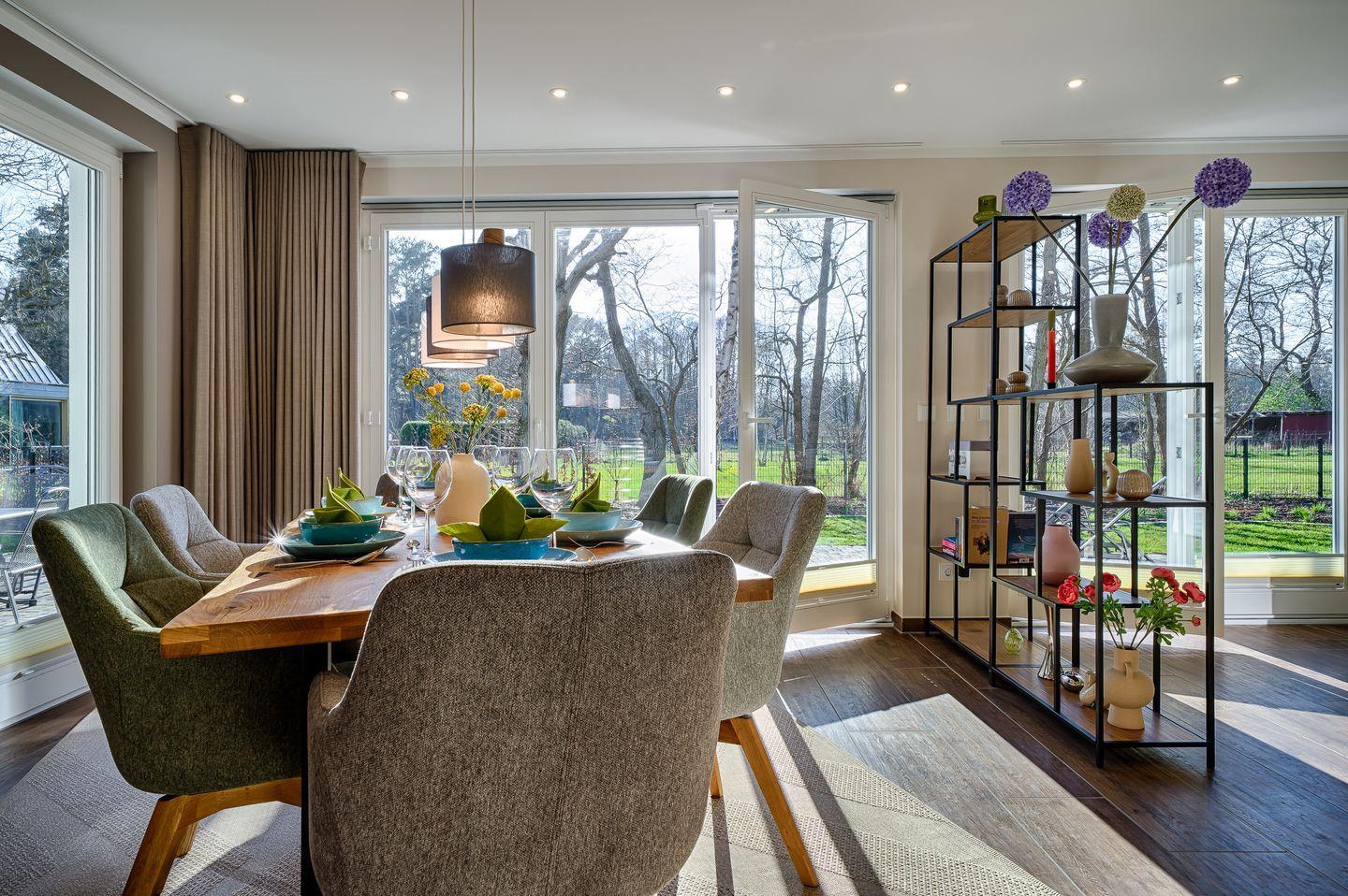 bodentiefe Fensterfront im EG und OG mit Blick in den Garten