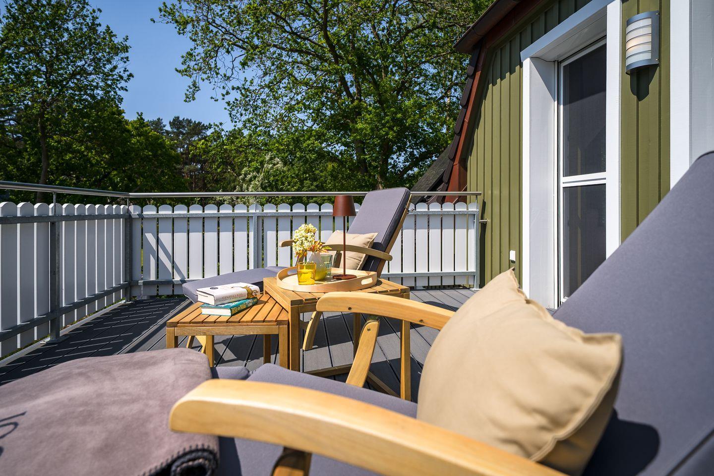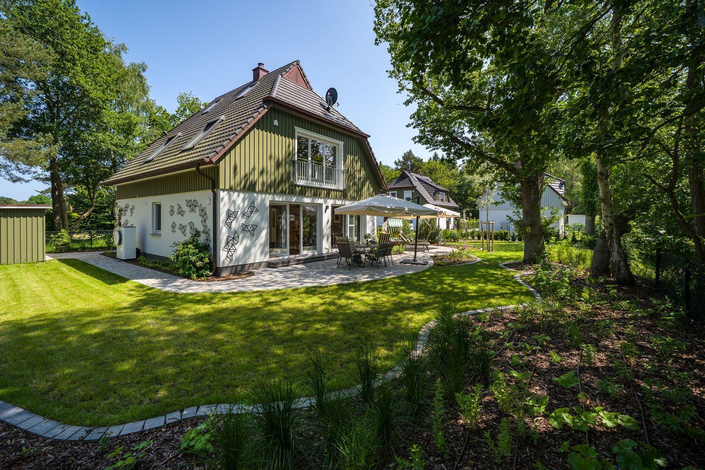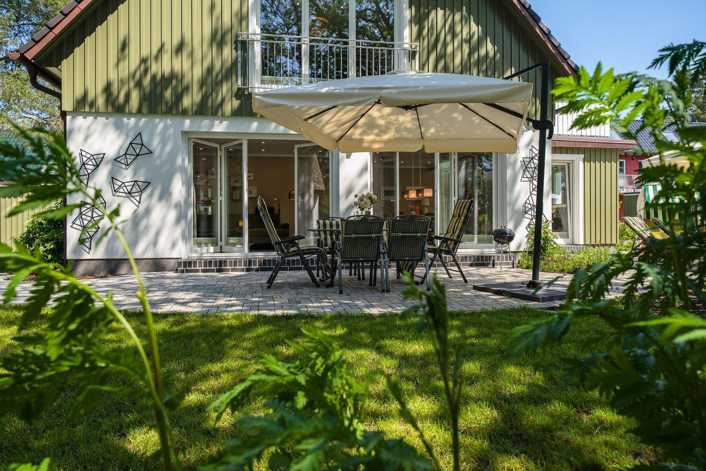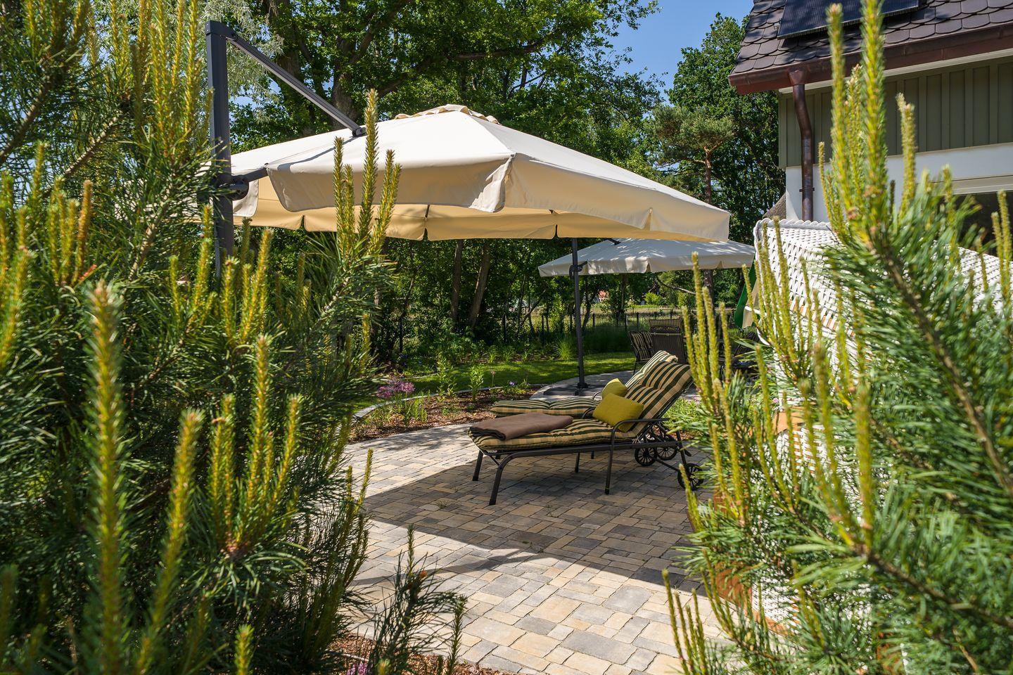 Große Terrasse mit Gartenmöbeln, Sonnenschirm, Strandkorb (Mai-Oktober), Holzkohlegrill, 2 Sonnenliegen