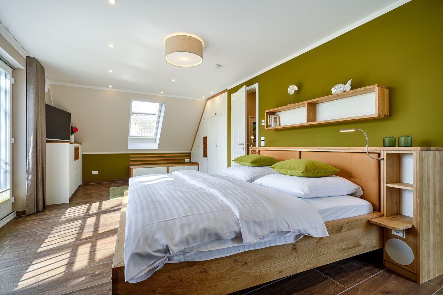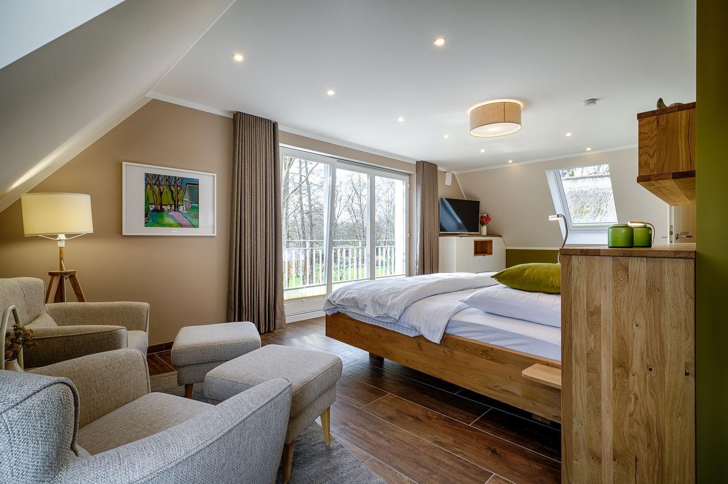 1 großzügiges Schlafzimmer mit Doppelbett (1,80 x 2,00 m) und Zugang zur Dachterrasse, TV, Sitzecke